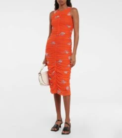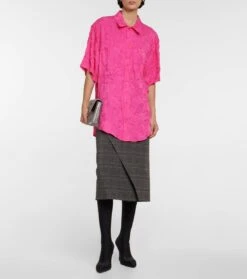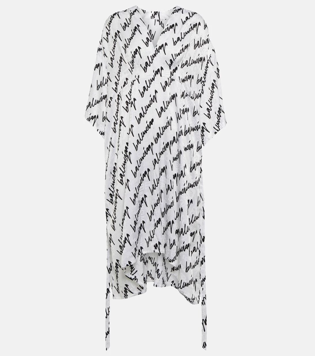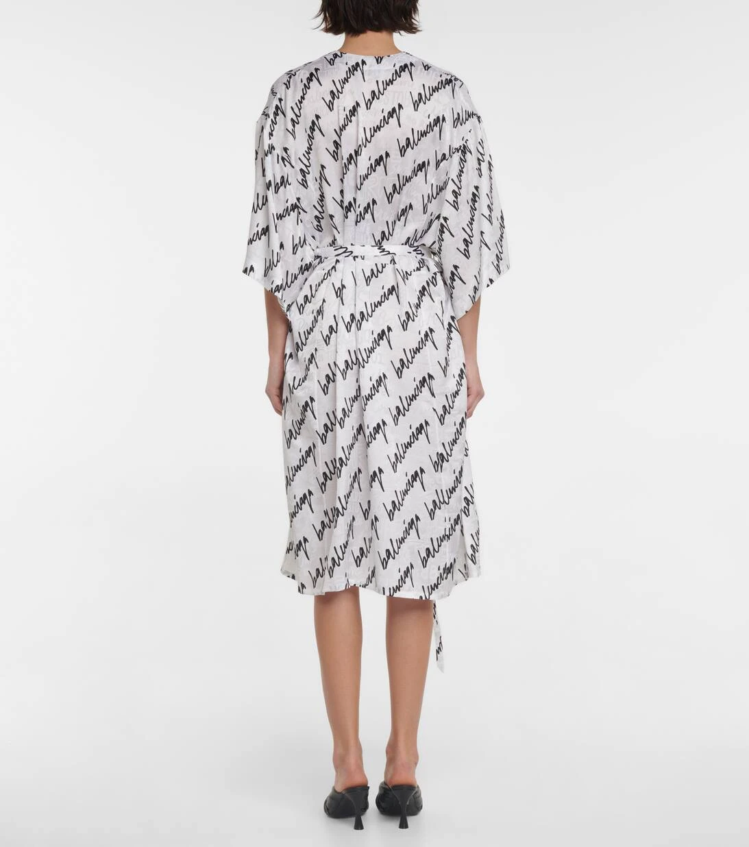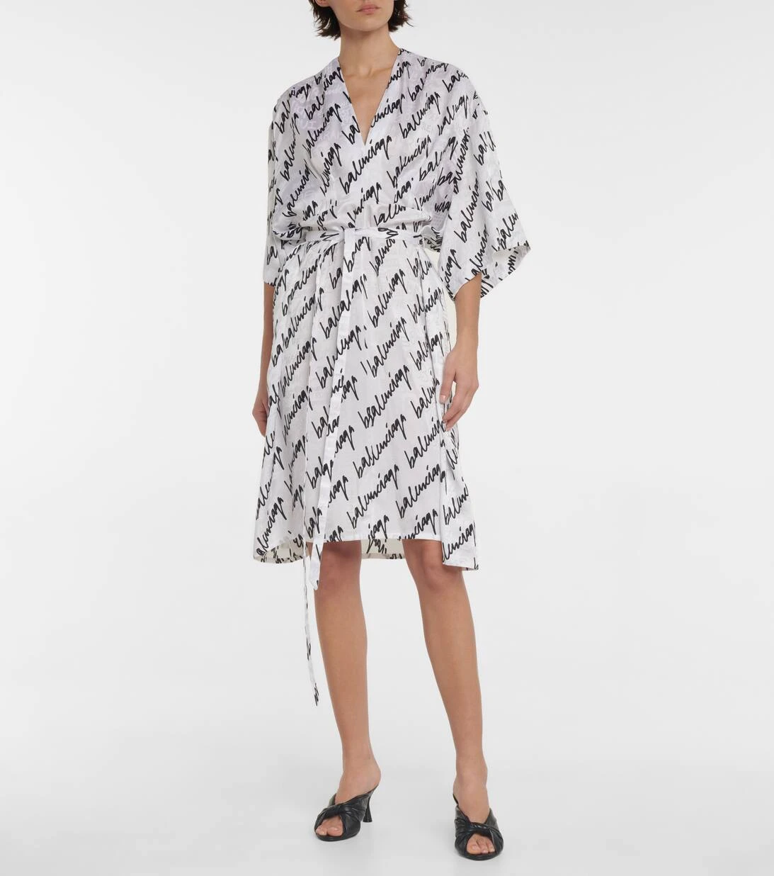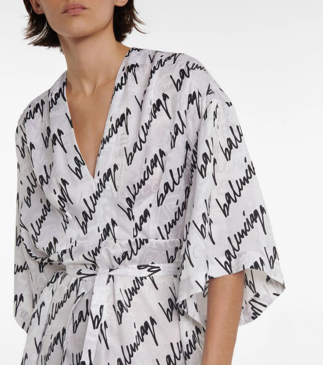 Das weiße New Scribble Midikleid von Balenciaga besitzt einen Oversized-Schnitt mit durchdachten Raffungen an den Schultern und einem Gürtel, der die Taille betont. Das Modell ist in Italien aus Seiden-Jacquard gefertigt, wobei der New Scribble Allover-Logoprint auf die Pariser Wurzeln des Hauses verweist.