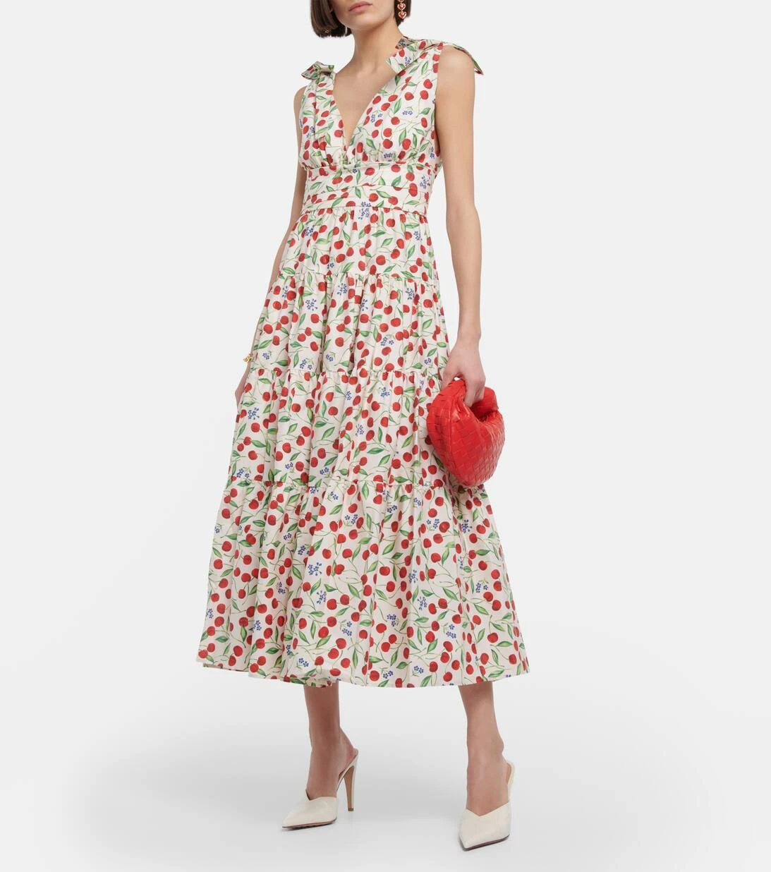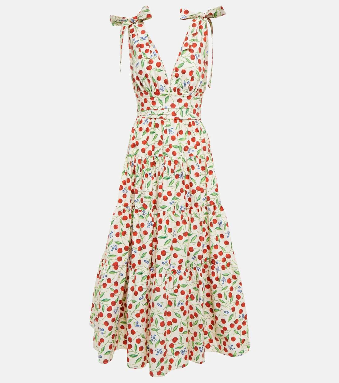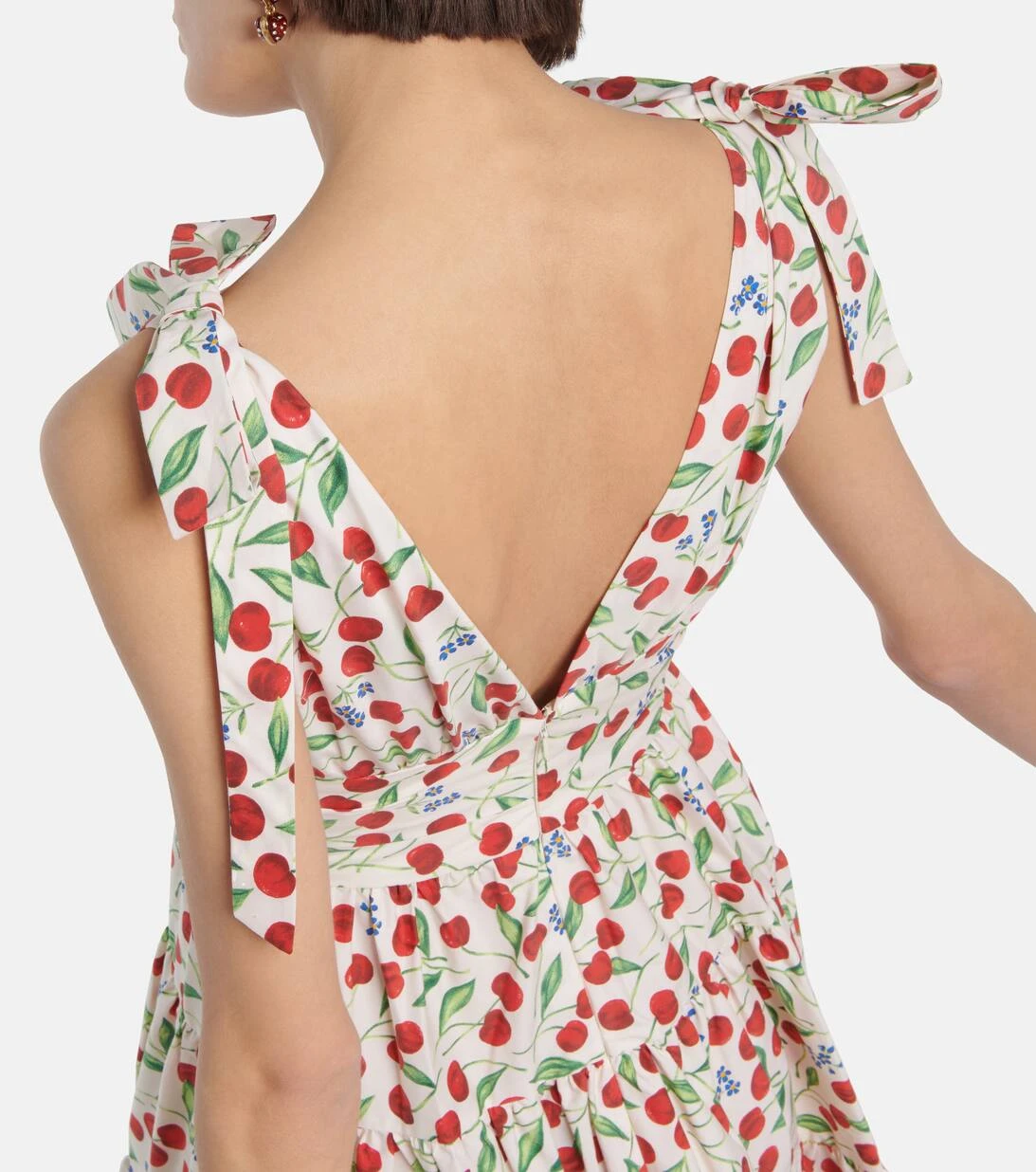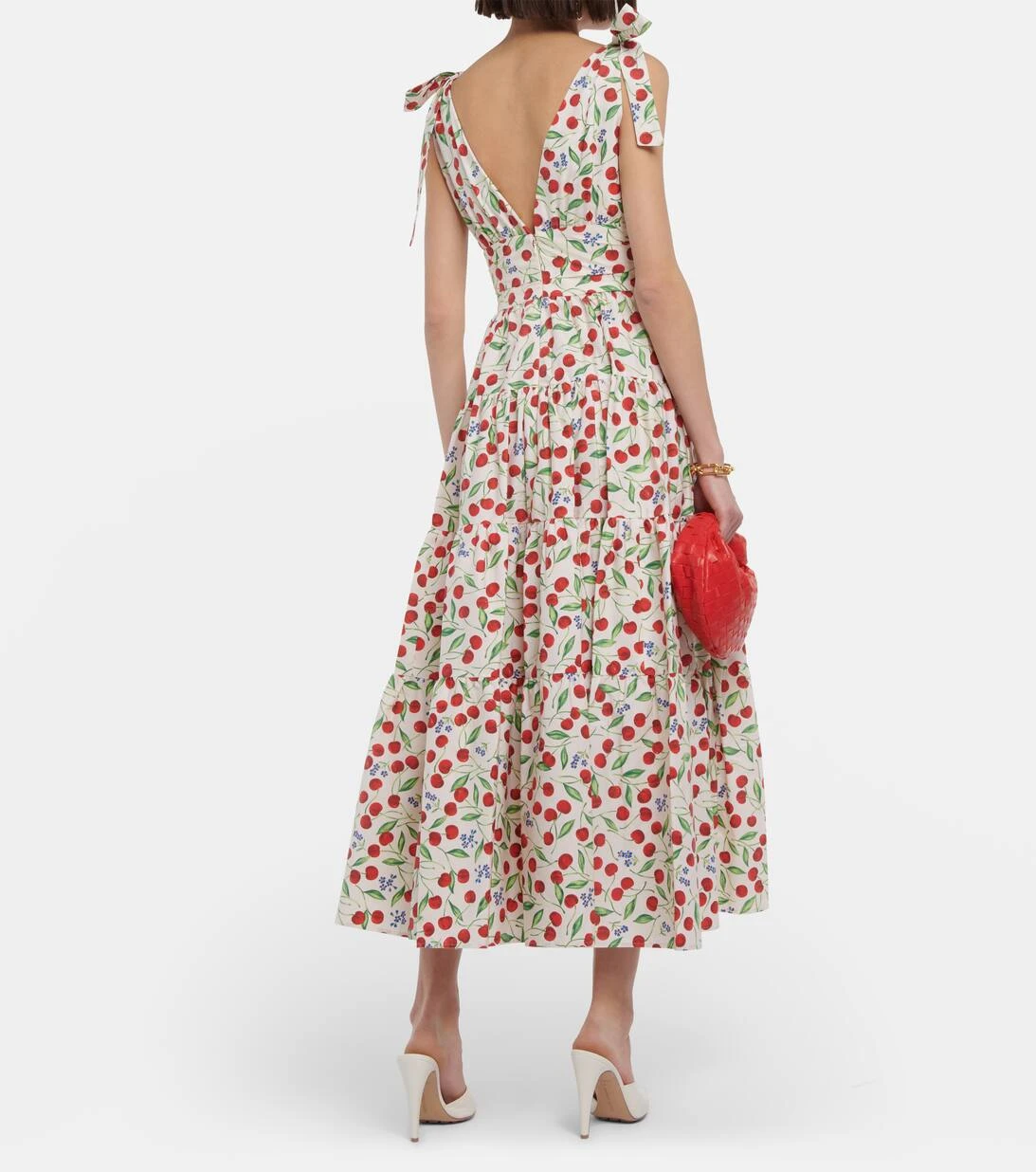 Dieses gestufte Midikleid mit einem dynamischen Kirschenprint von Carolina Herrera ist eine herausragende Wahl für Ihre nächste Cocktailparty. Es wurde aus einem festen Baumwollgemisch gefertigt und verfügt über einen tiefen Ausschnitt sowie Träger zum Binden.