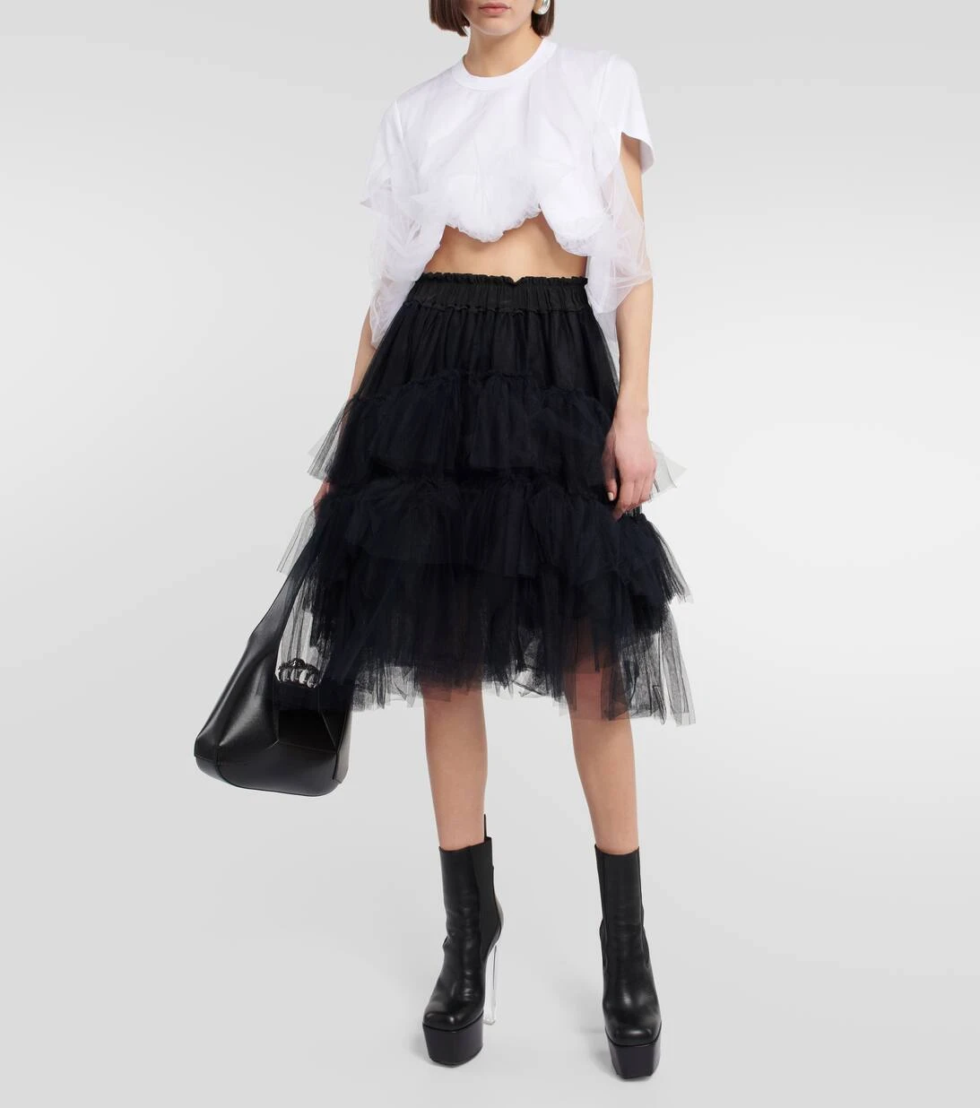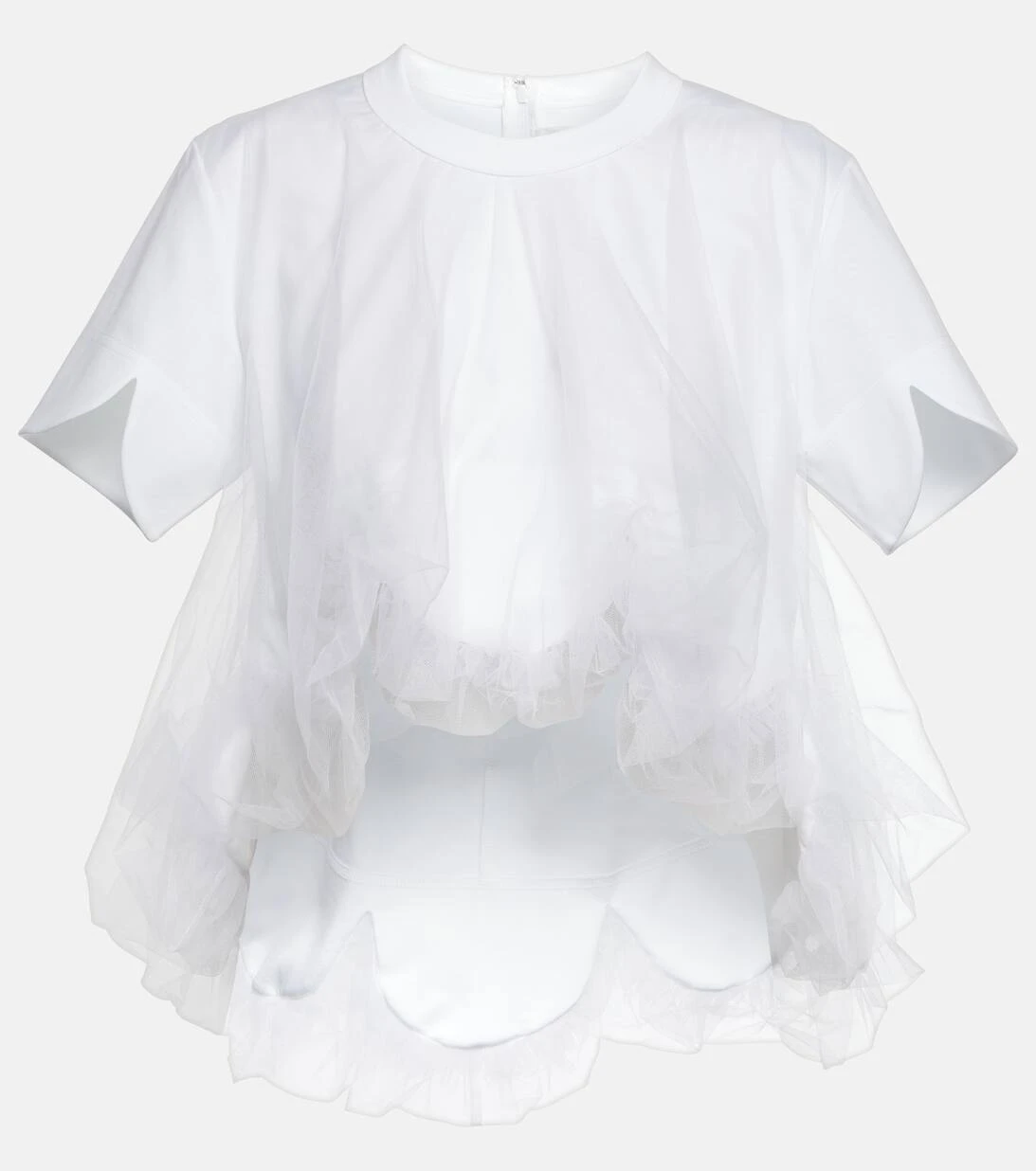Dieses Top ist mit schrägen Ärmeln und gerafften Lagen aus Tüll am verkürzten Saum versehen. In transparenten Partien oder in Rüschen gerafft ist Tüll das perfekte Material für die ausdrucksstarken Designs von Noir Kei Ninomiya.