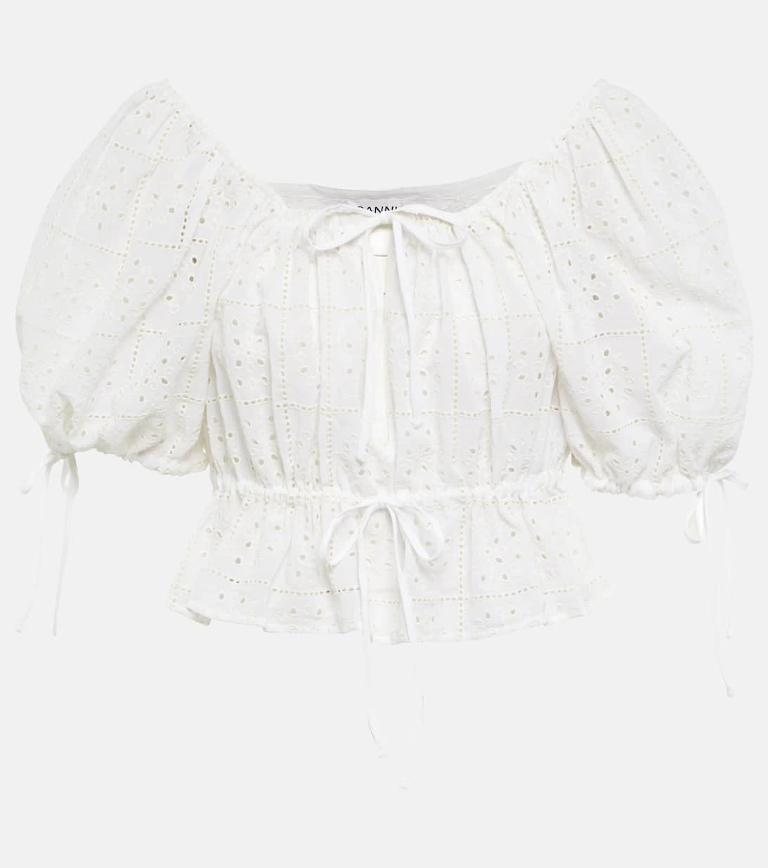Dieses Cropped-Top aus Baumwolle von Ganni verleiht Ihren Looks ein entspannt elegantes Finish. Das Design aus Lochspitze verfügt über einen karreeförmigen Ausschnitt, einen offenen Rücken und mehrere Zugbänder.