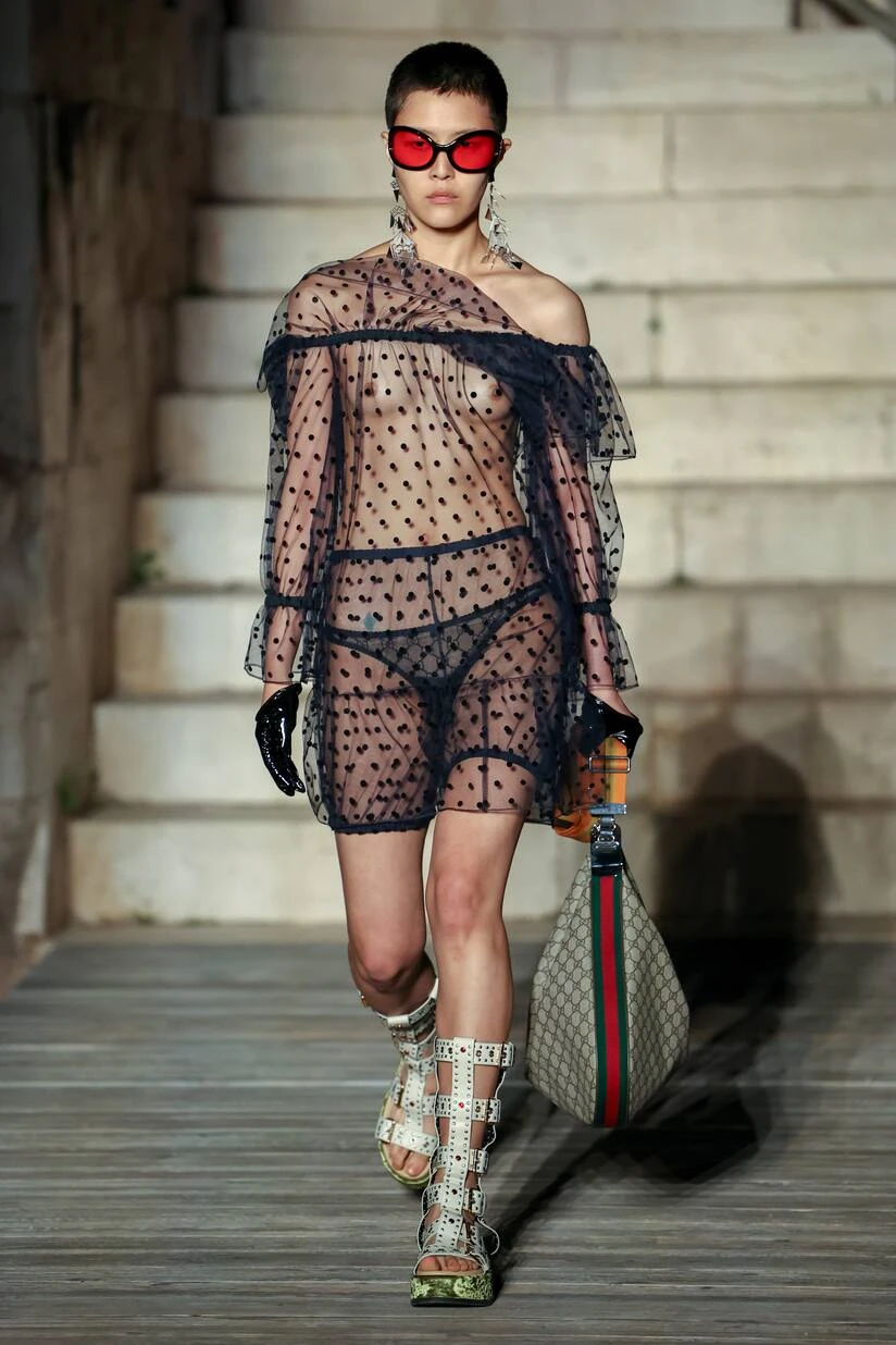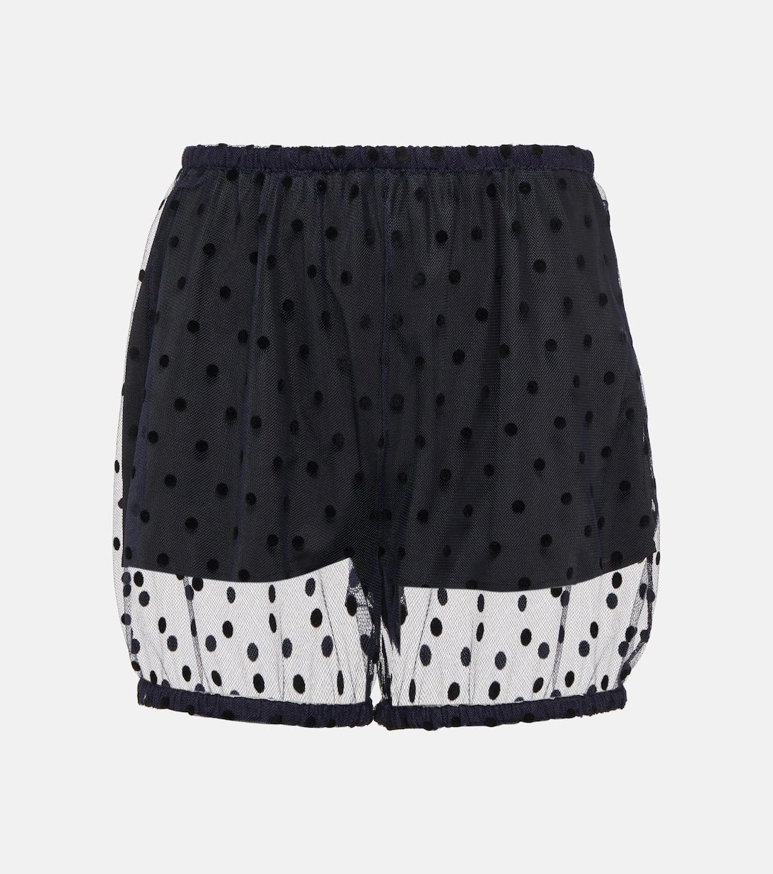Diese dunkelblauen Shorts von Gucci verfügen über ein transparentes Overlay aus Point d’Esprit-Tüll.