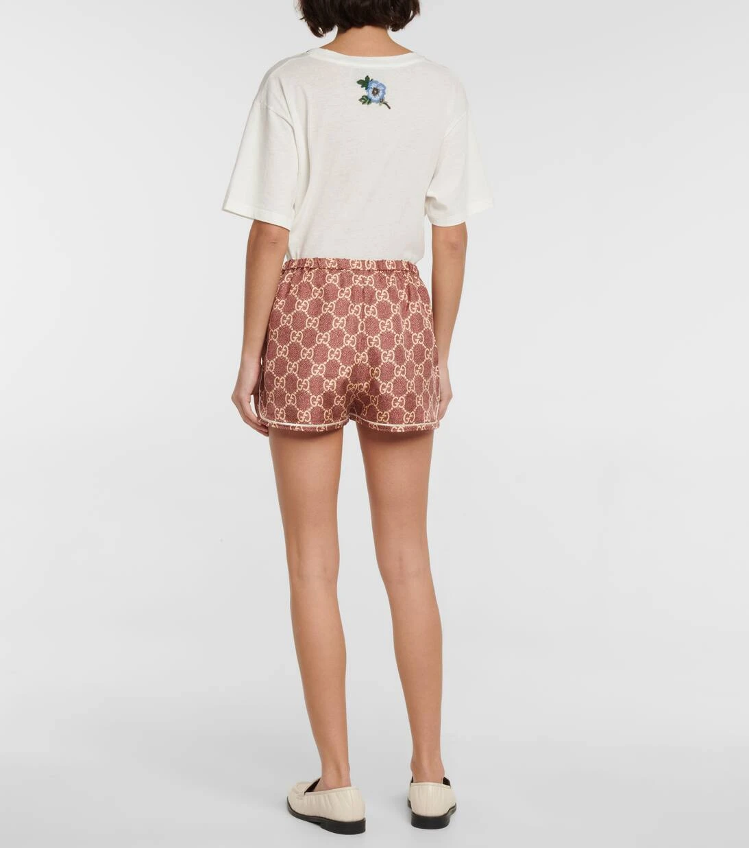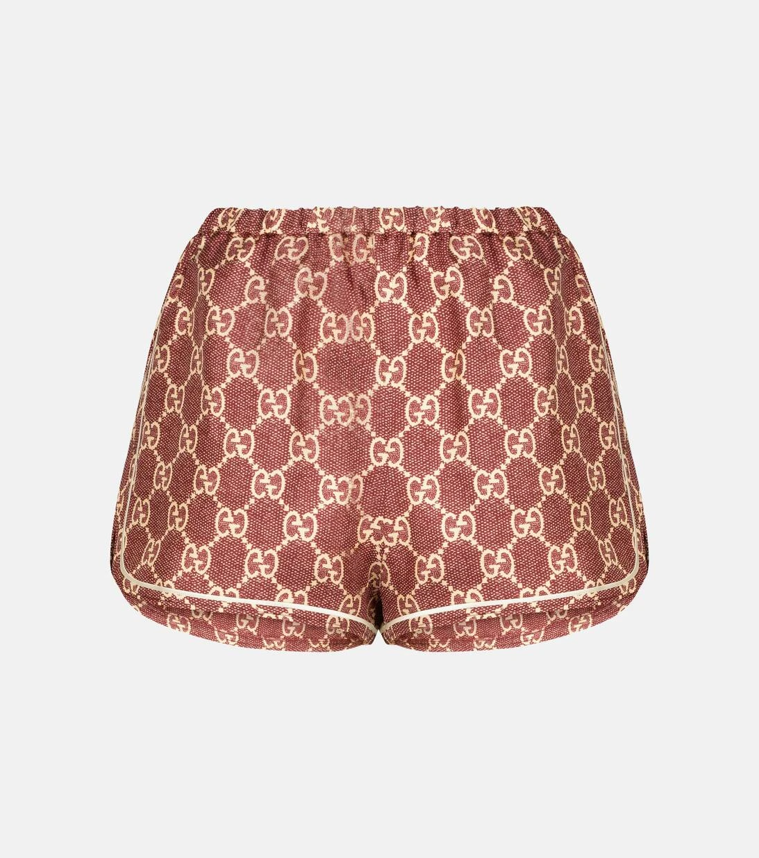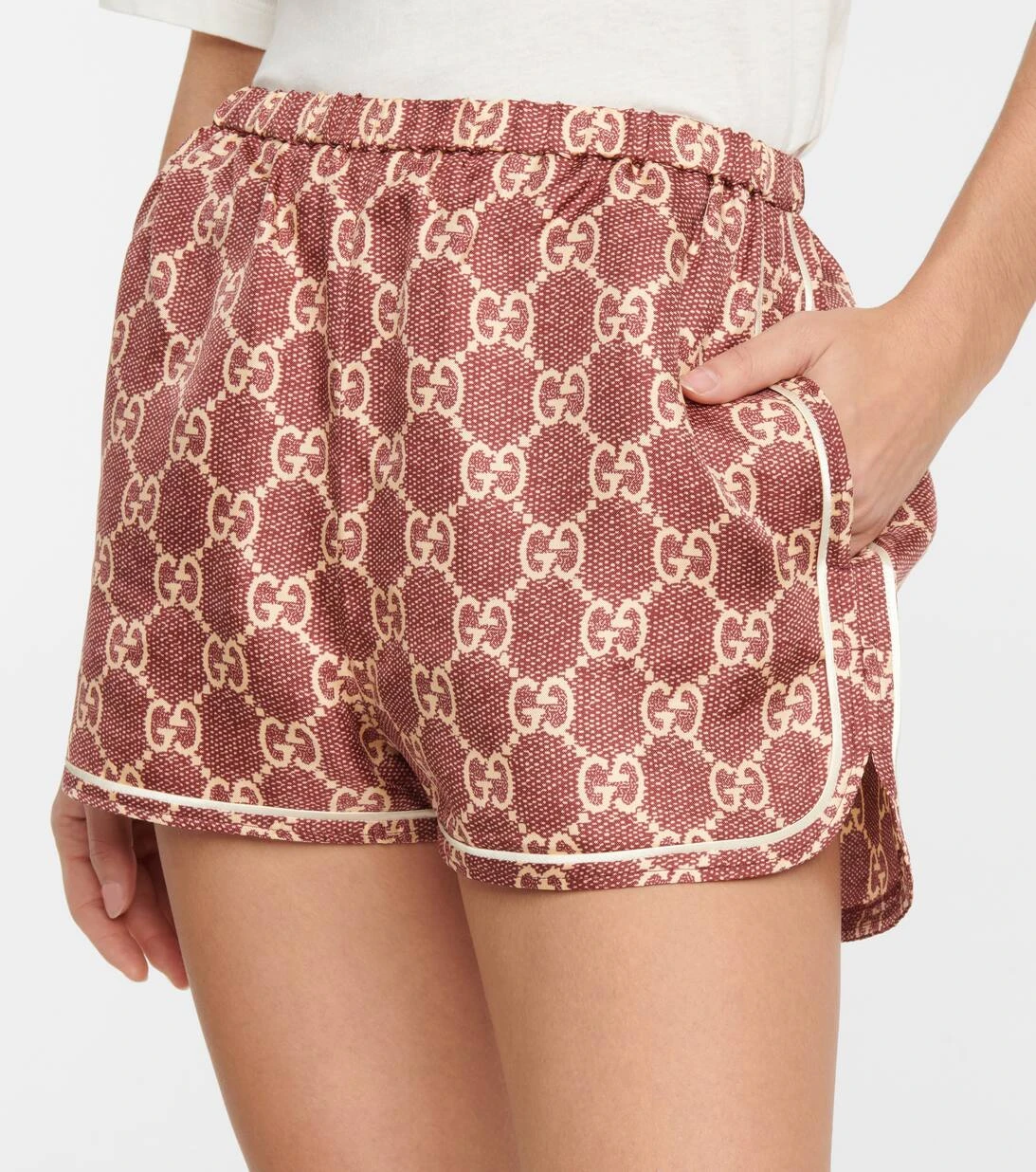 In labeltypischer 70s-Manier präsentieren sich diese sportlichen Shorts von Gucci. Das rote Modell wurde in Italien aus Bio-Seiden-Twill gefertigt und mit schimmernden Lamé-Streifen sowie dem GG-Supreme-Muster in hellem Beige akzentuiert. Dank des elastischen Bunds können Sie das Design mal etwas höher und mal tiefer auf der Hüfte tragen.