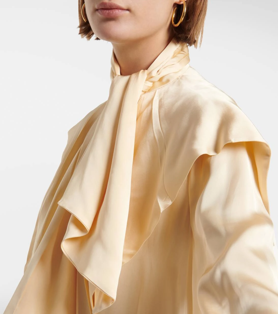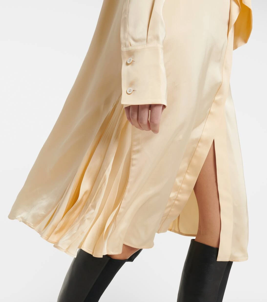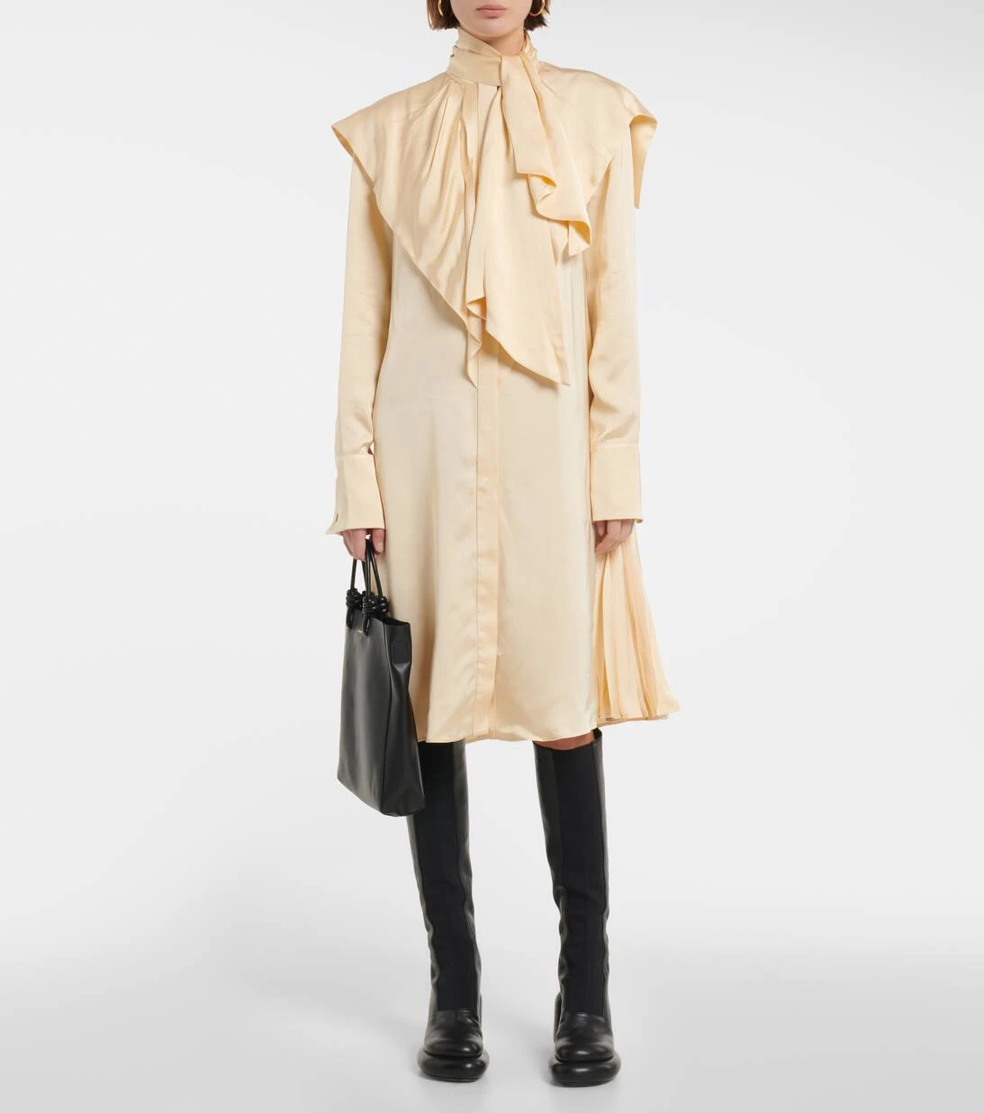 Dieses Hemdblusenkleid von Jil Sander wurde aus cremefarbenem Satin mit Bahnen im Cape-Stil und einem Ausschnitt zum Binden gefertigt.