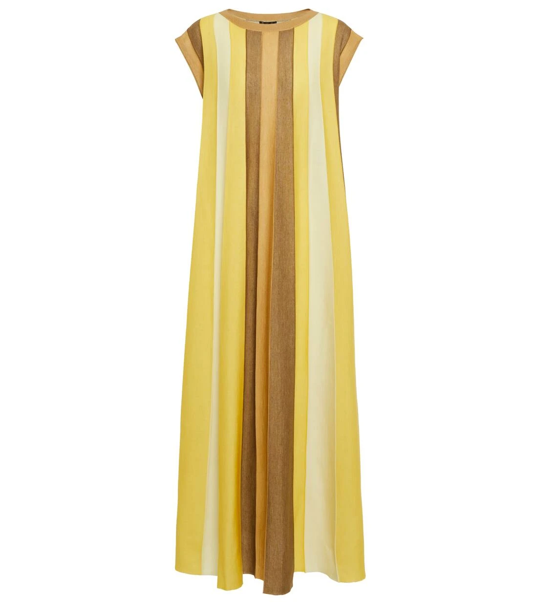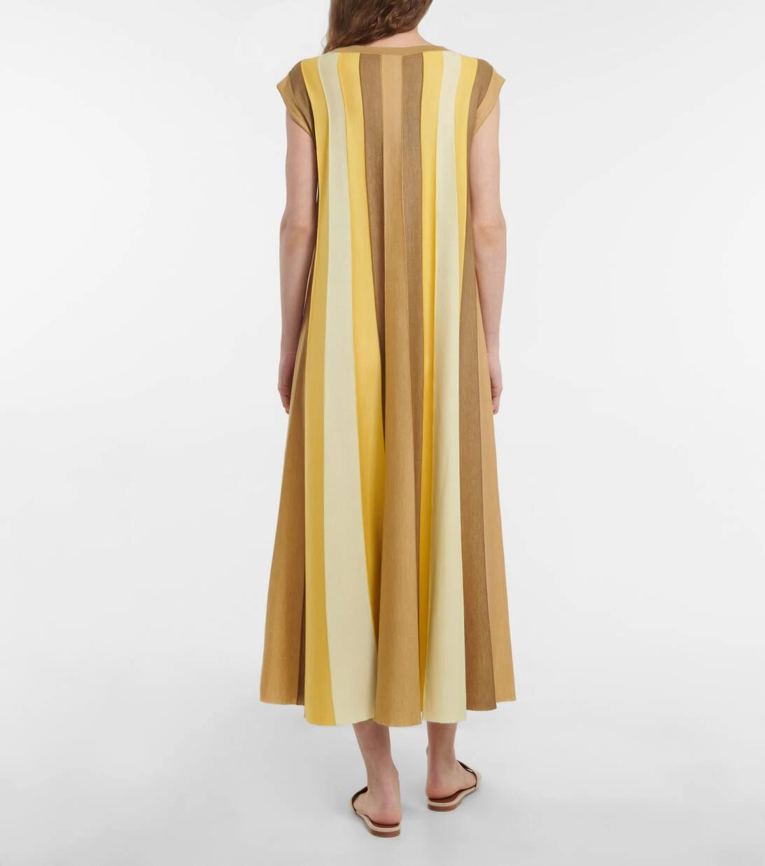 Das Edinburgh Midikleid von Loro Piana bietet einen eleganten Sommer-Look. Die ärmellose Silhouette aus Kaschmir und Seide besticht durch Blockstreifen und schmeichelnd-fließende Plissees.