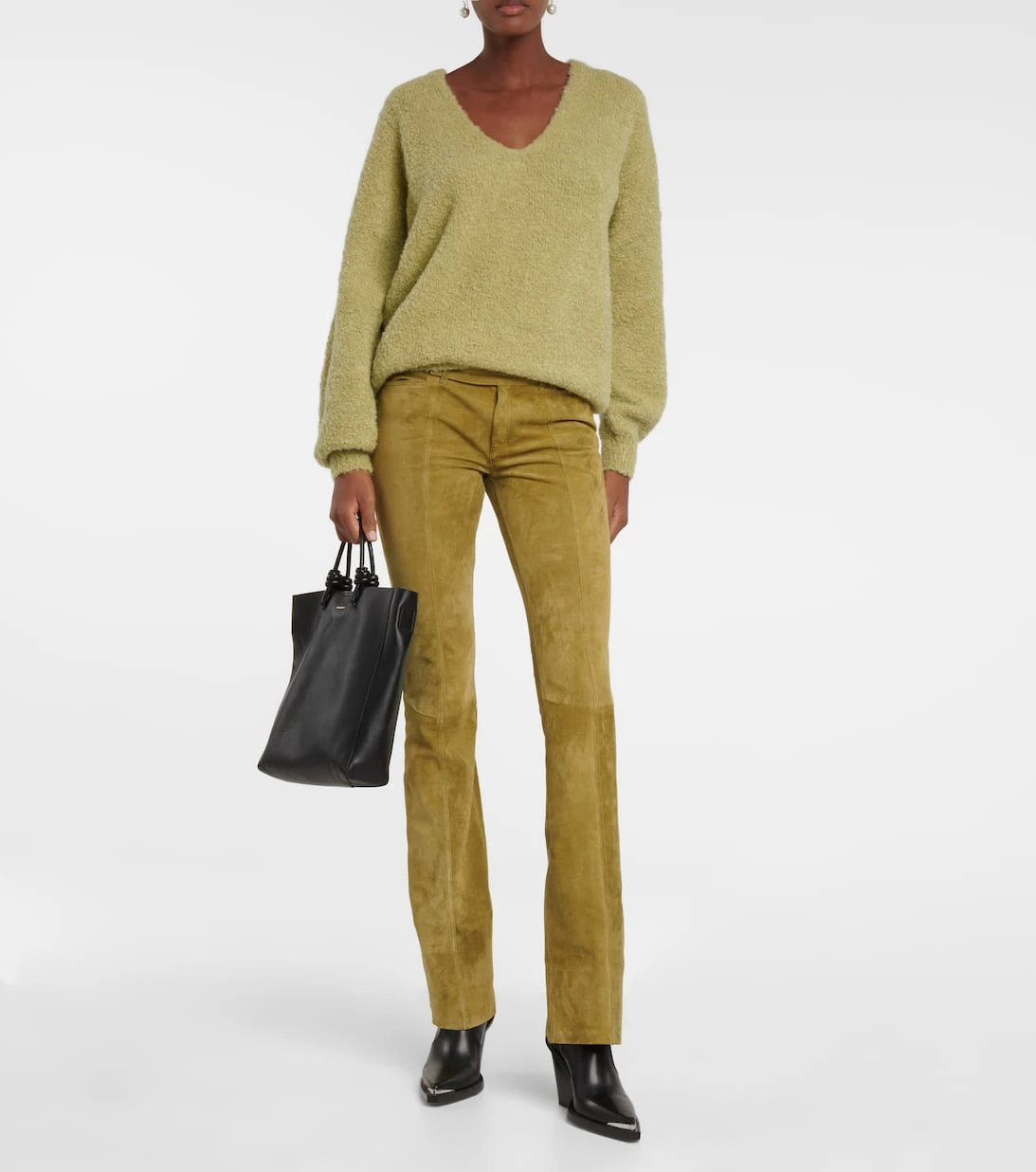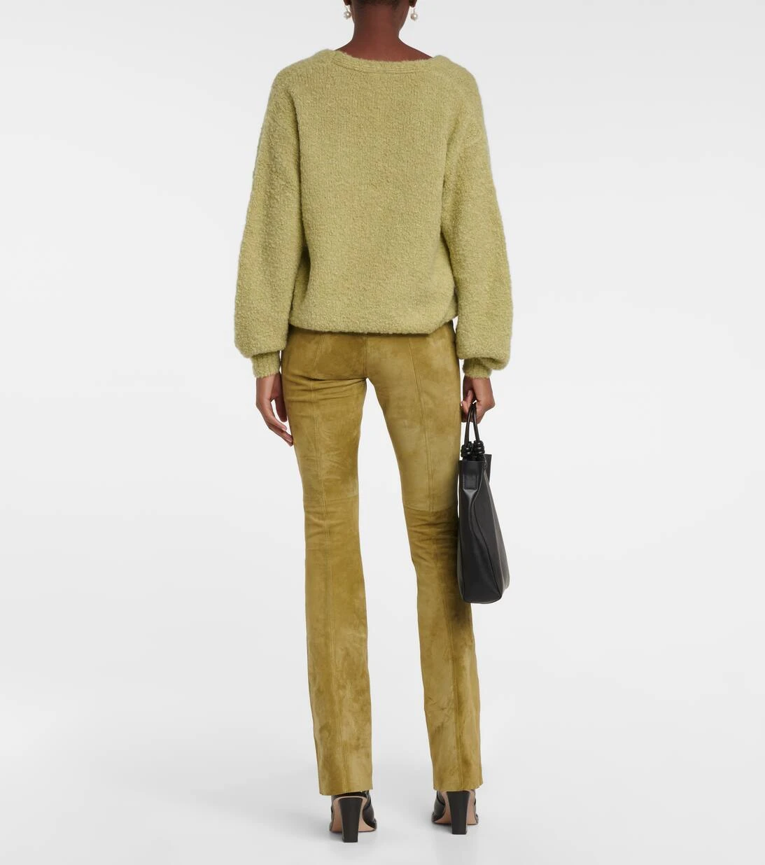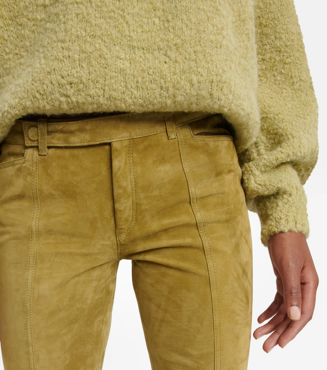 Mit der Gerino Hose aus Veloursleder beweist Petar Petrov seine Expertise in der Lederverarbeitung. Dieses Low-Rise-Modell in Pistaziengrün zeigt sich mit einem langen, schmalen Bein, das zum Saum hin leicht ausgestellt ist.