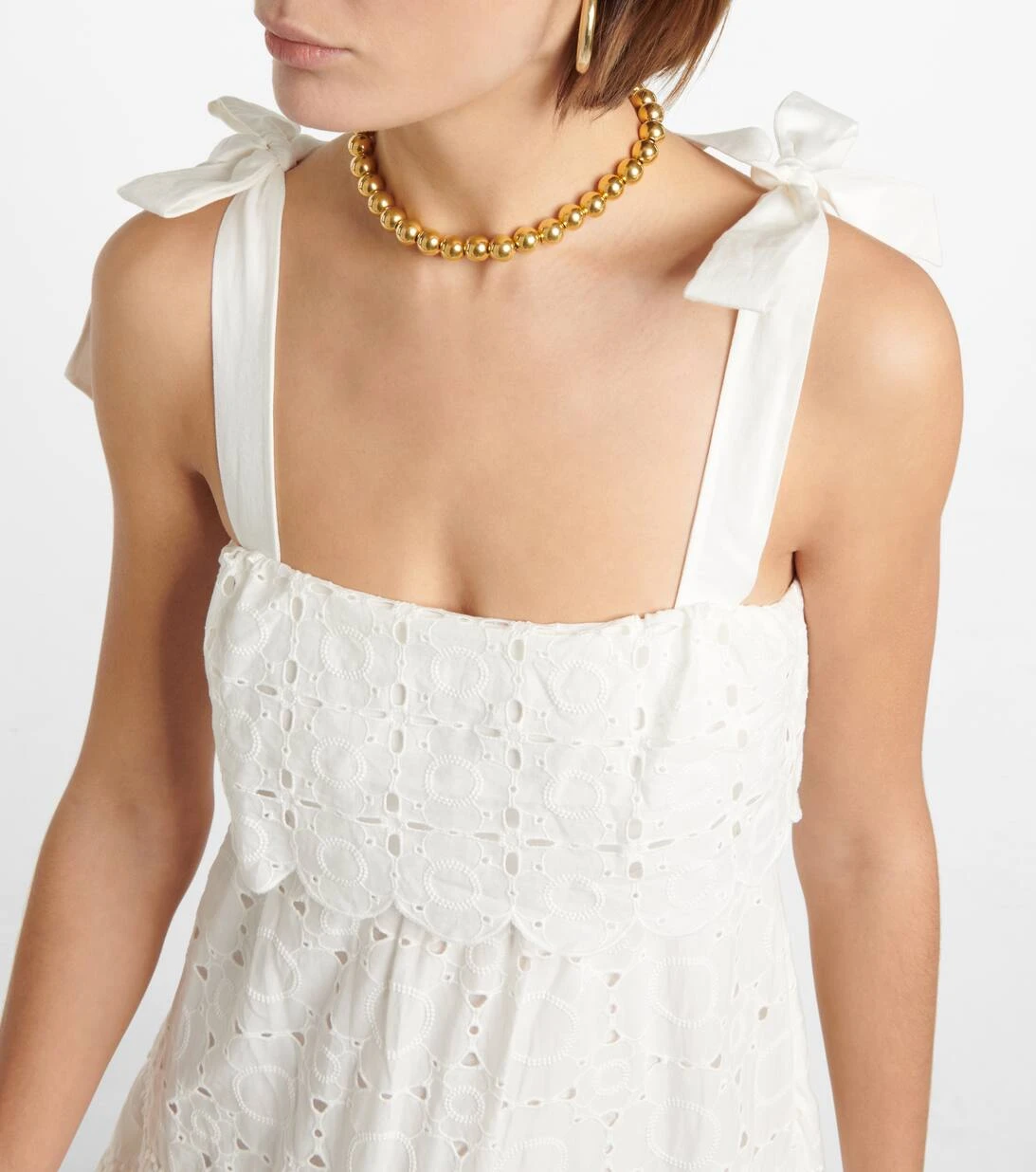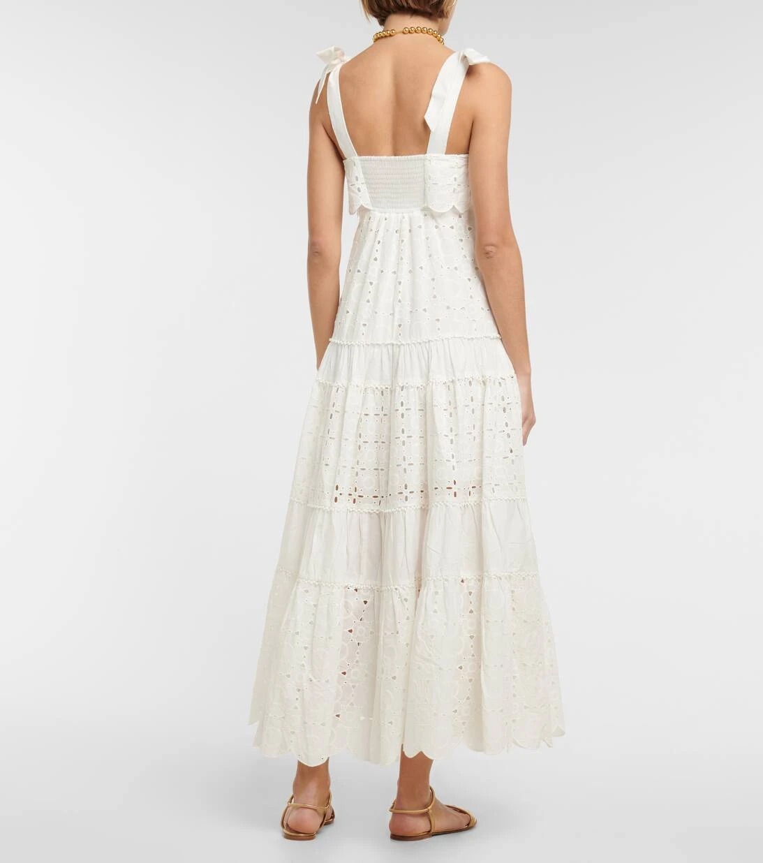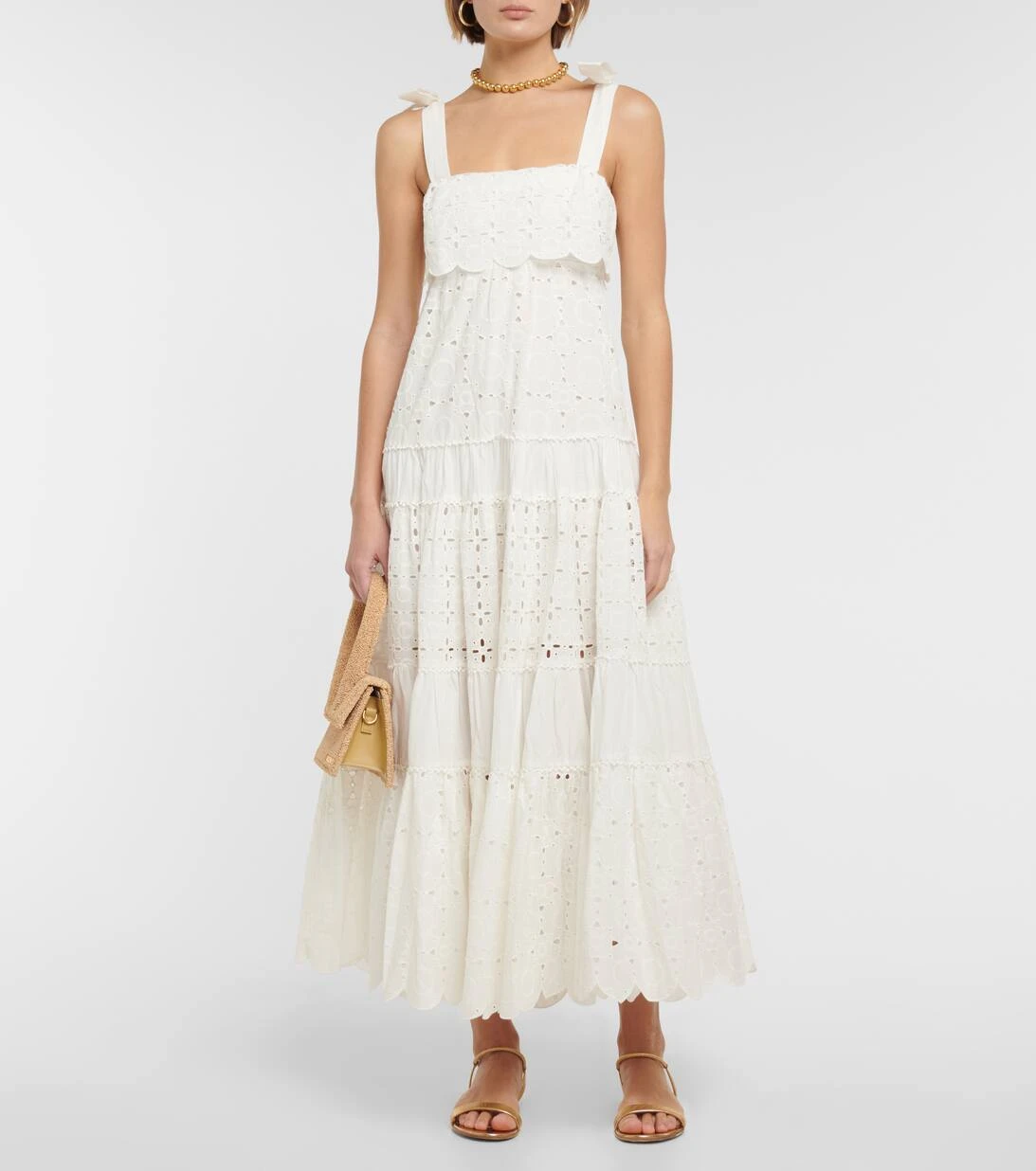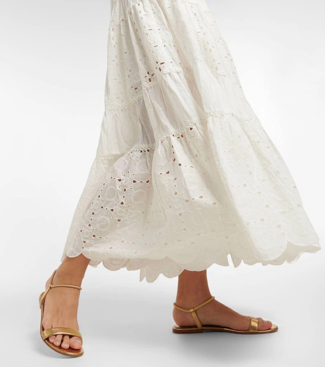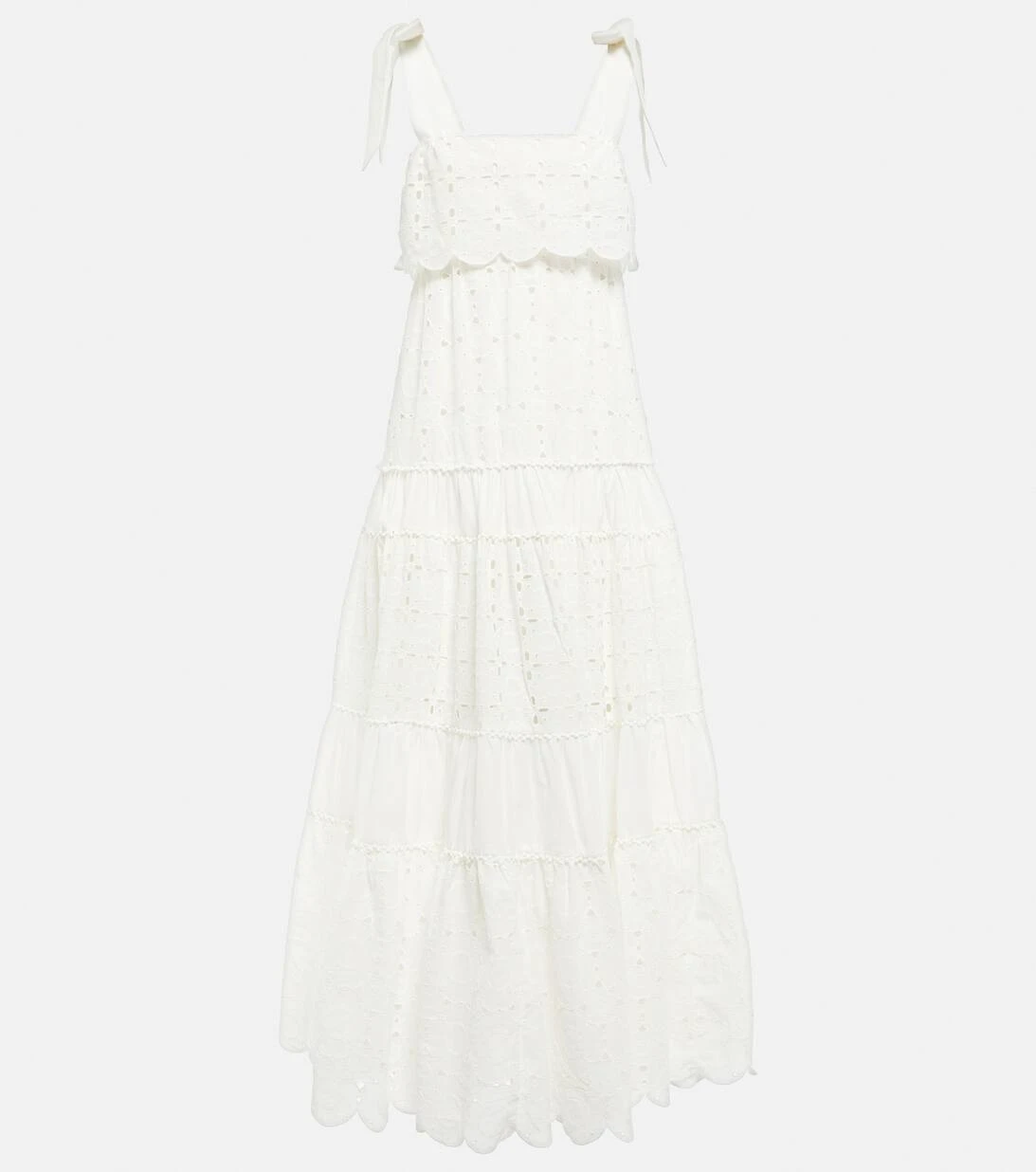 Luftig locker ist dieses Maxikleid von Alémais. Das Modell wurde komplett aus Baumwolle gefertigt und mit aufwendigen Ösendetails sowie Bändern an beiden Schultern versehen.