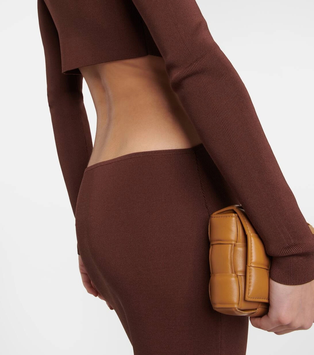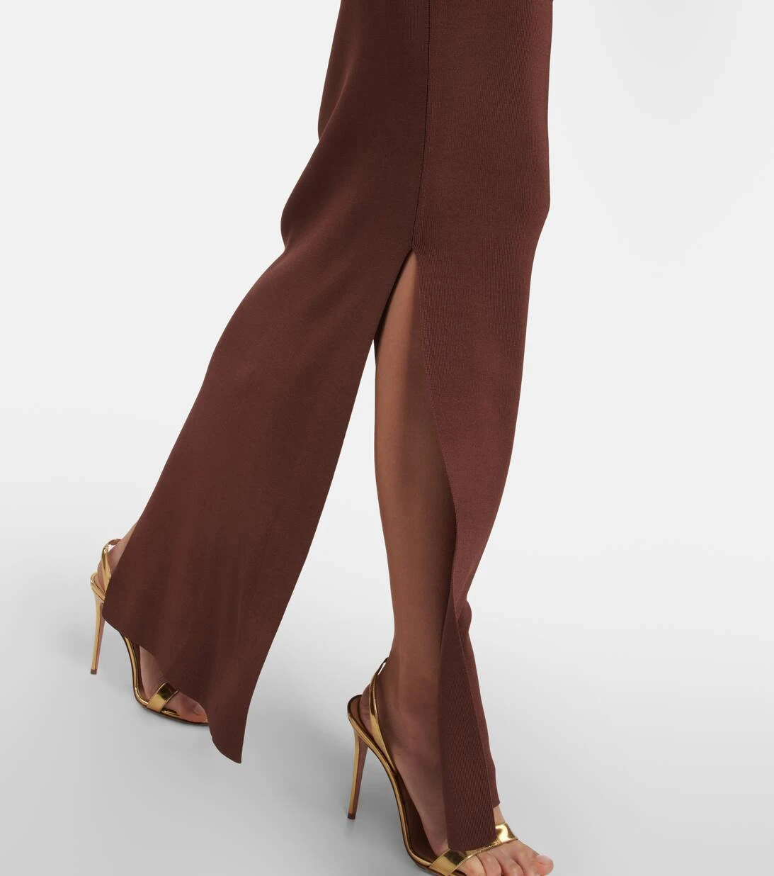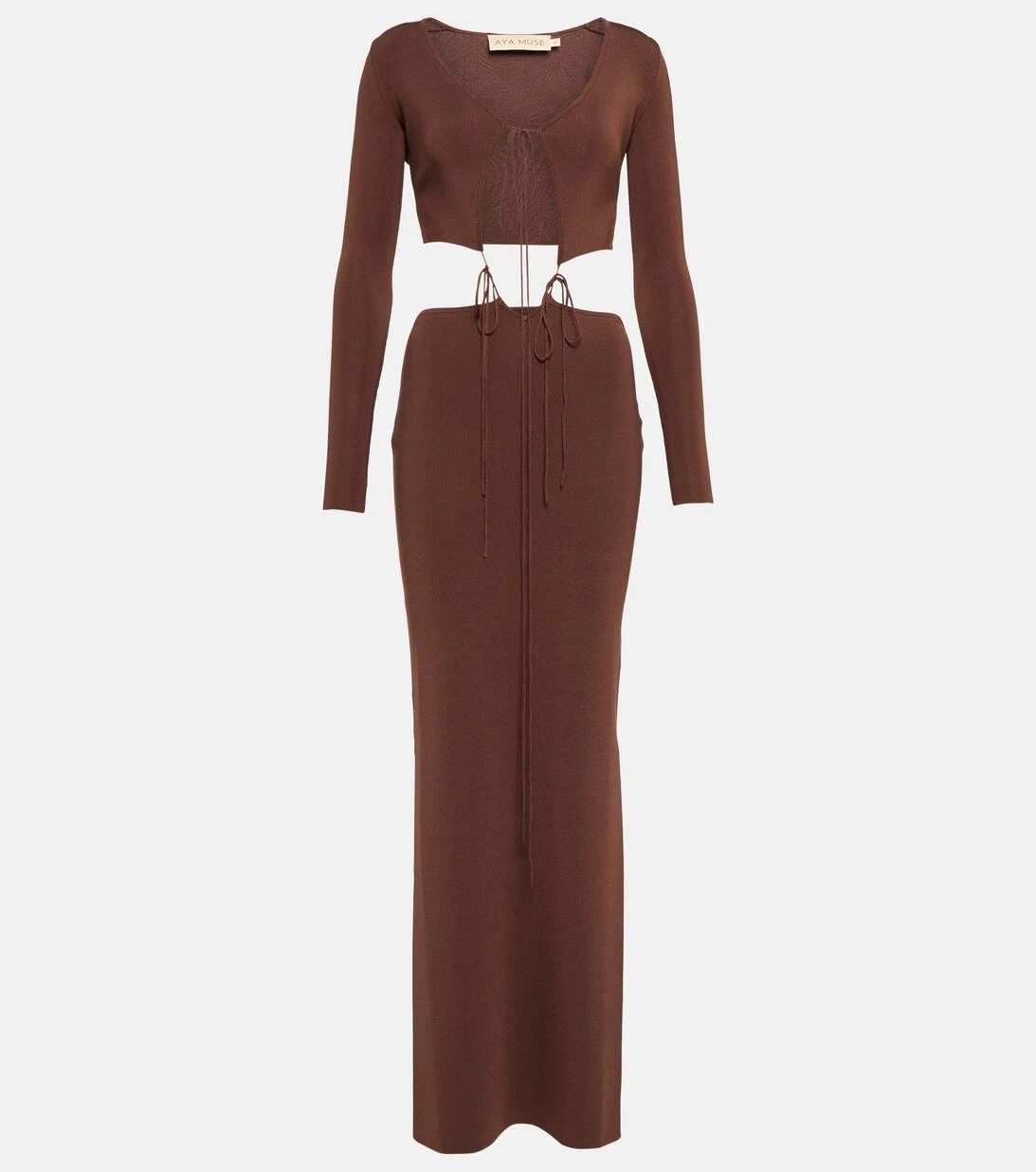 Das Lapponi Kleid von Aya Muse ist ein zweiteiliges Design, das mit zarten Riemen verbunden ist. Das aus feinem Rippstrick gefertigte Modell hat eine schmale Passform und einen langen Saum mit hohem Beinschlitz.