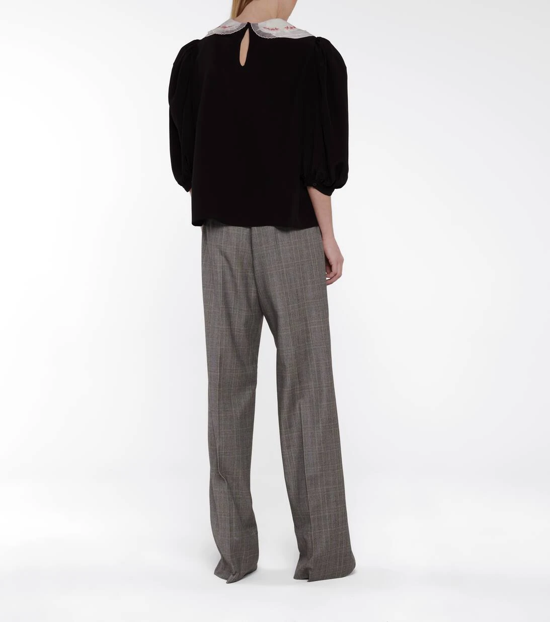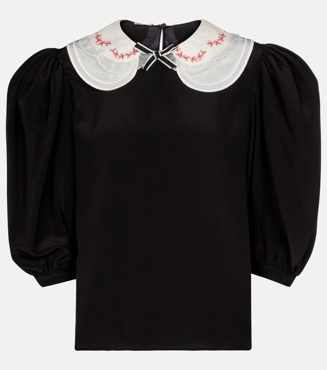 Besonders feminin zeigt sich diese schwarze Bluse von Miu Miu, die in Italien aus fließendem Crêpe de Chine aus reiner Seide gefertigt wurde. Das Modell verfügt über eine lockere Passform und ist mit einem romantischen Spitzenkragen sowie langen Puffärmeln akzentuiert. Tragen Sie sowohl Miniröcke als auch lässige Denim-Styles dazu.