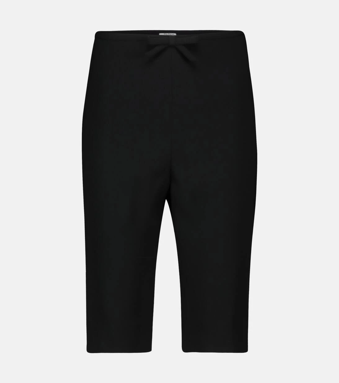 Für seine neueste Kreation nahm sich das mailändische Traditionshaus Miu Miu die Silhouette der derzeit beliebten Biker Shorts als Vorbild und wandelte diese in eine elegante Version aus Cady um. Die kurze Hose liegt nicht ganz so eng an, wie ihr sportliches Pendant und begeistert hier durch ein labeltypisches Schleifendetail am Bund. Das schwarze Modell wurde in Italien gefertigt und mit einem verdeckten Reißverschluss an der Seite akzentuiert. Tragen Sie es sowohl zu flachen Sneakers als auch zu hohen Pumps.