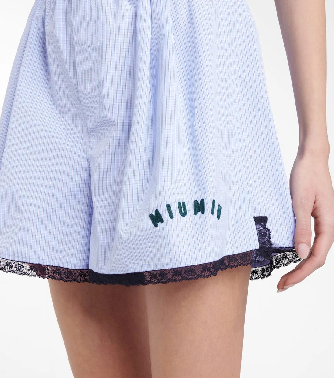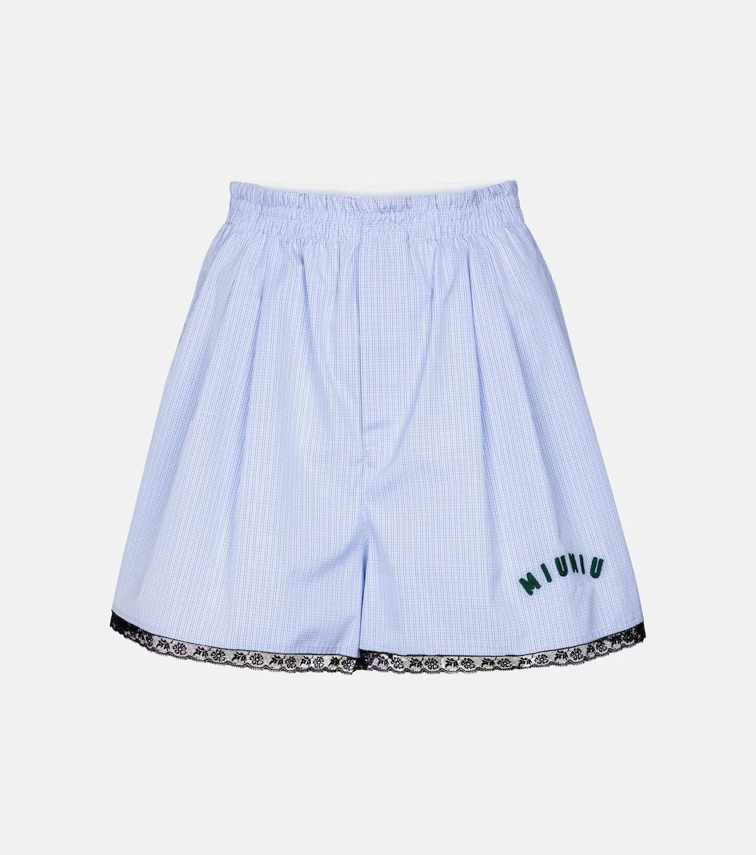 Borrowed from the Boys: Mit diesen hellblauen Shorts von Miu Miu, die im Stil von klassischen Boxershorts gestaltet sind, kreieren wir jetzt einen stilvollen Loungewear-Look. Das karierte Modell wurde aus Baumwolle gefertigt und verfügt über einen elastischen Bund. Schwarze Spitze am Saum sorgt für einen sinnlich-femininen Abschluss. Tragen Sie einen lockeren Pullover dazu.