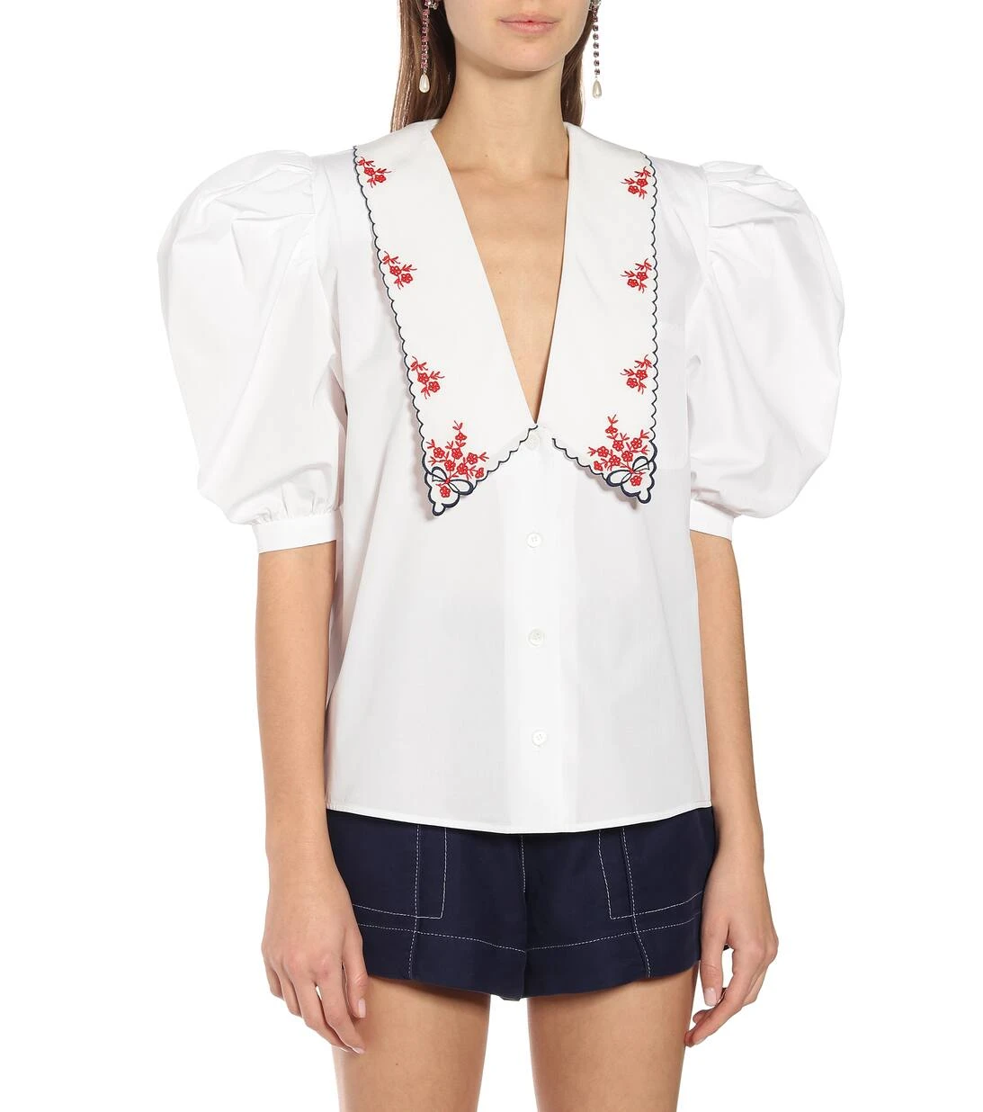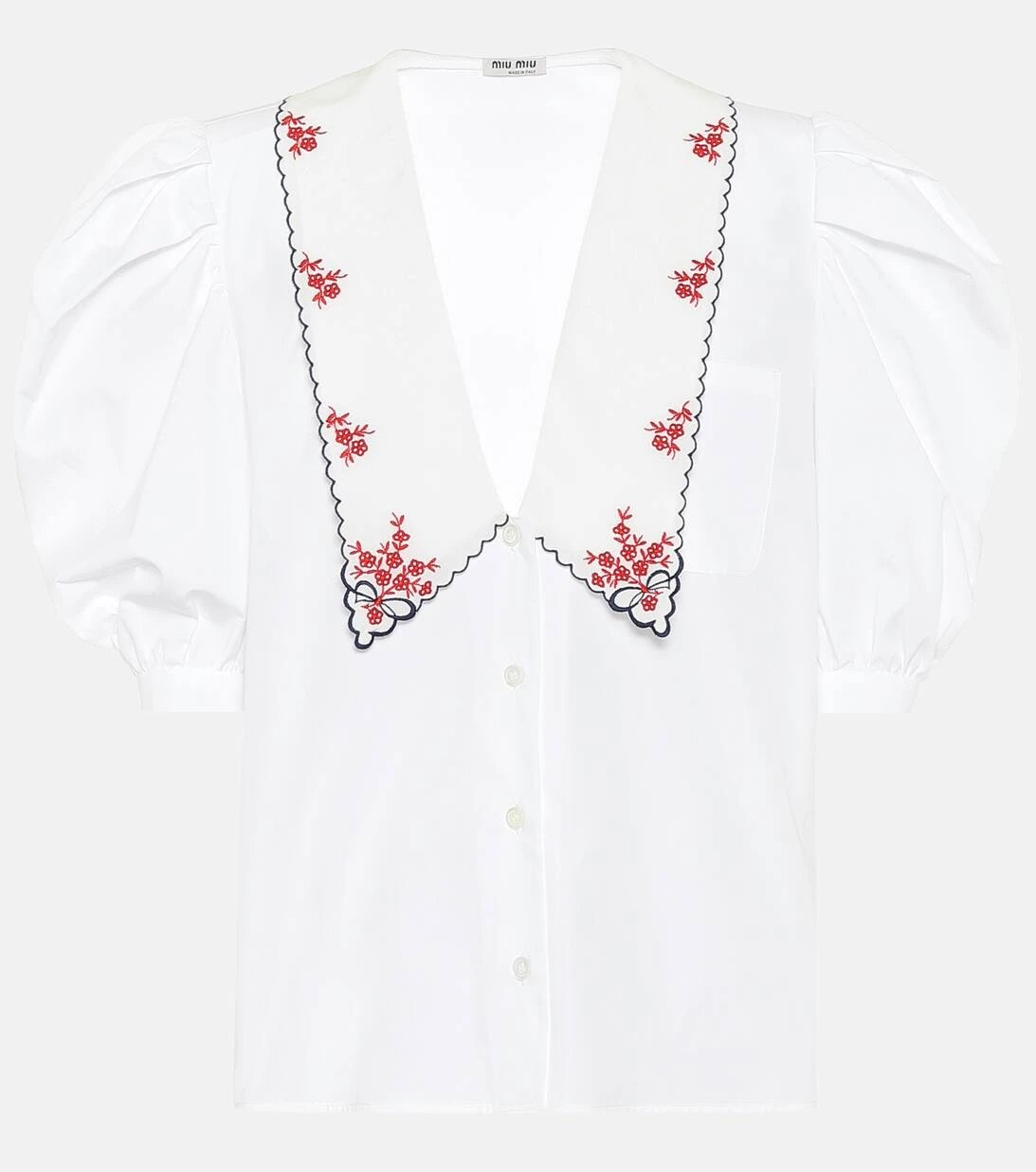 Eine charmante Blütenstickerei in Rot ziert den Kragen dieser weißen Bluse von Miu Miu. Das Design wurde in Italien aus reiner Baumwolle gefertigt und mit kurzen Puffärmeln sowie einem tiefen V-Ausschnitt versehen. Komplettieren Sie den femininen Look etwa mit plissierten Röcken.