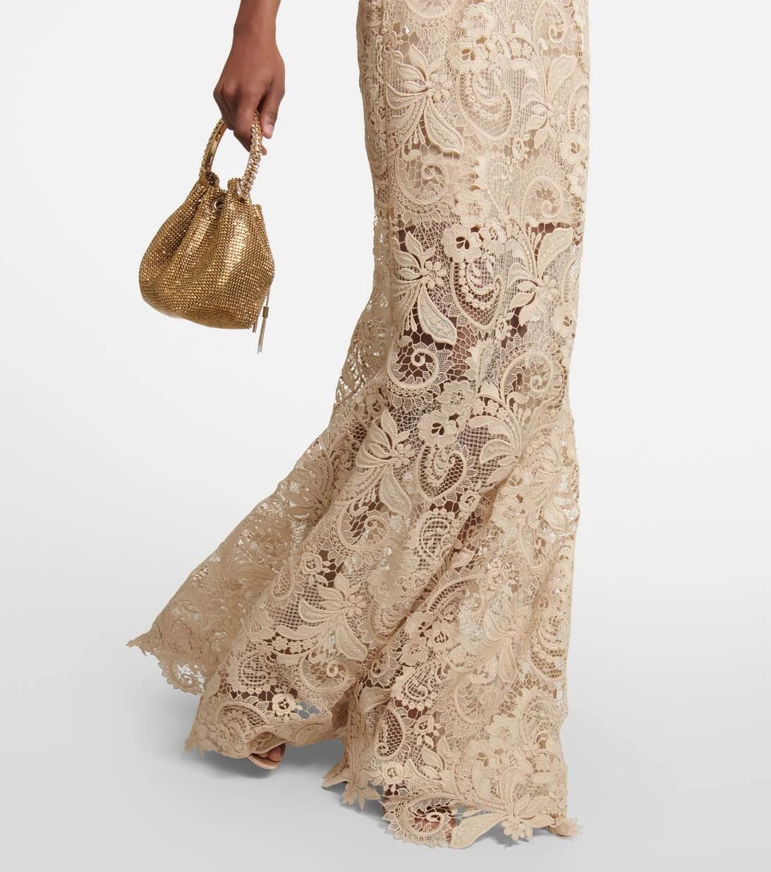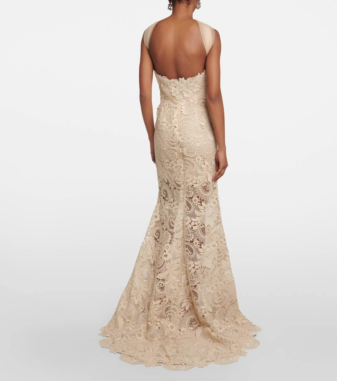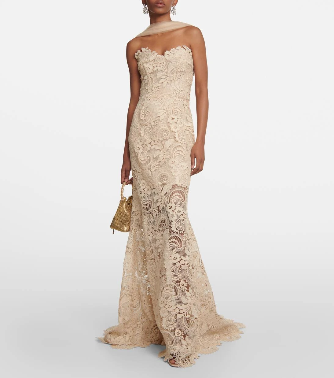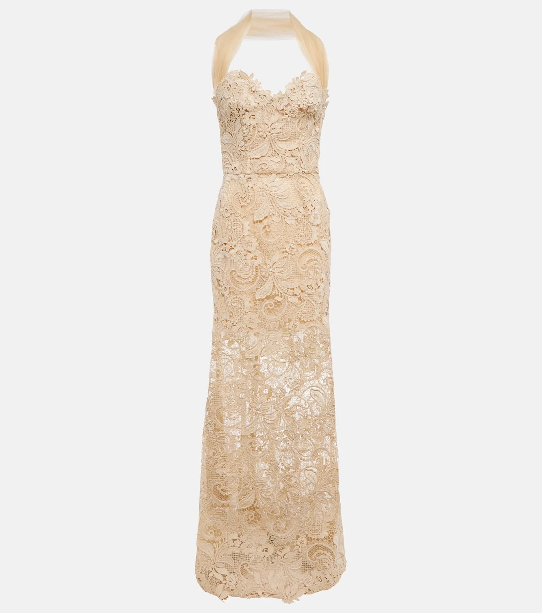 Diese in Italien aus Guipure-Spitze gefertigte Robe repräsentiert Oscar de la Rentas Gespür für exquisite Details. Das bodenlange Design mit schulterfreien Trägern aus Tüll zeichnet sich durch eine kleine Schleppe und einen herzförmigen Ausschnitt aus.