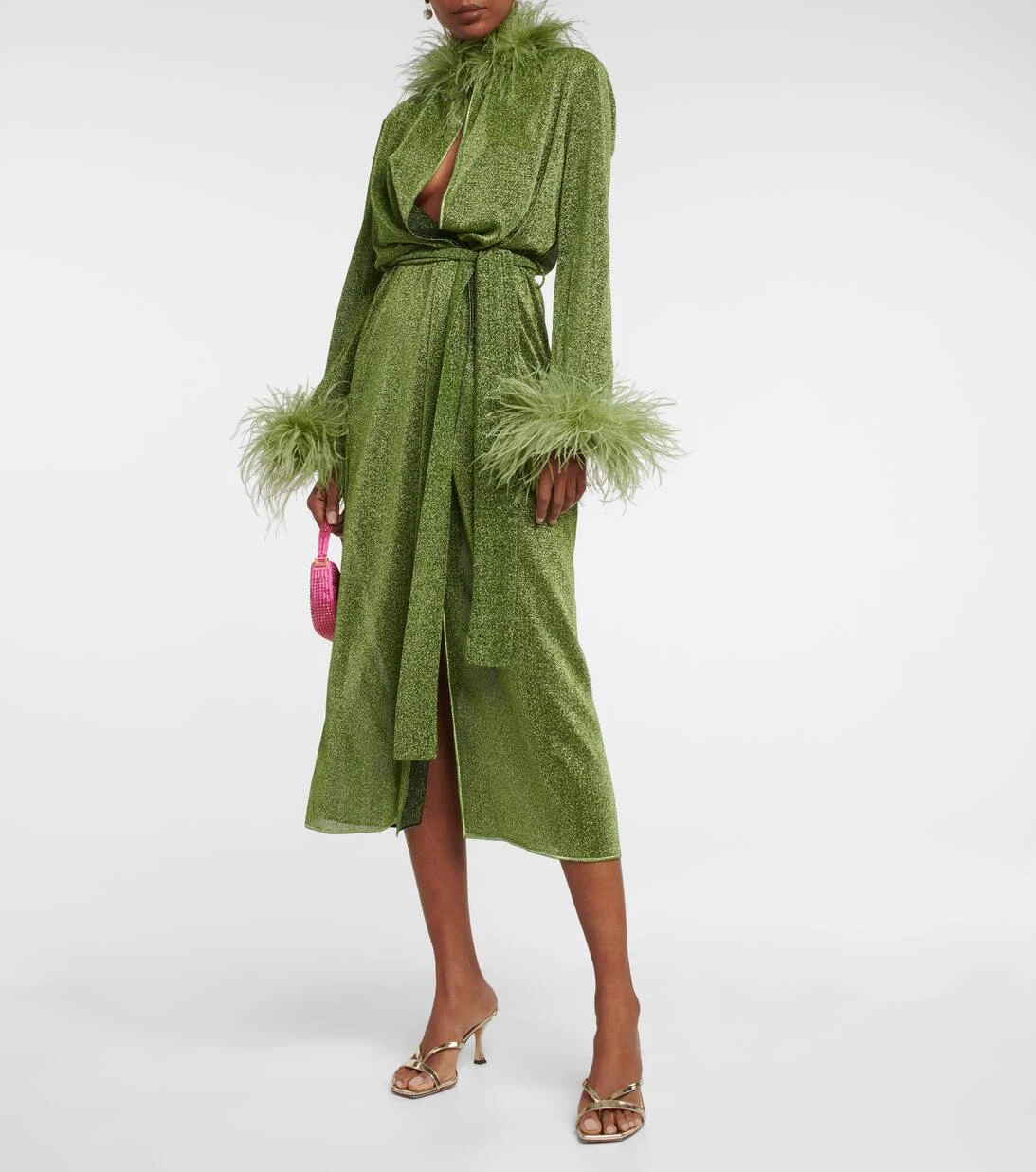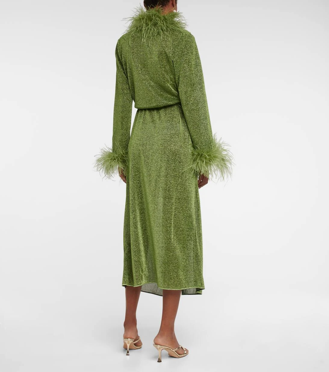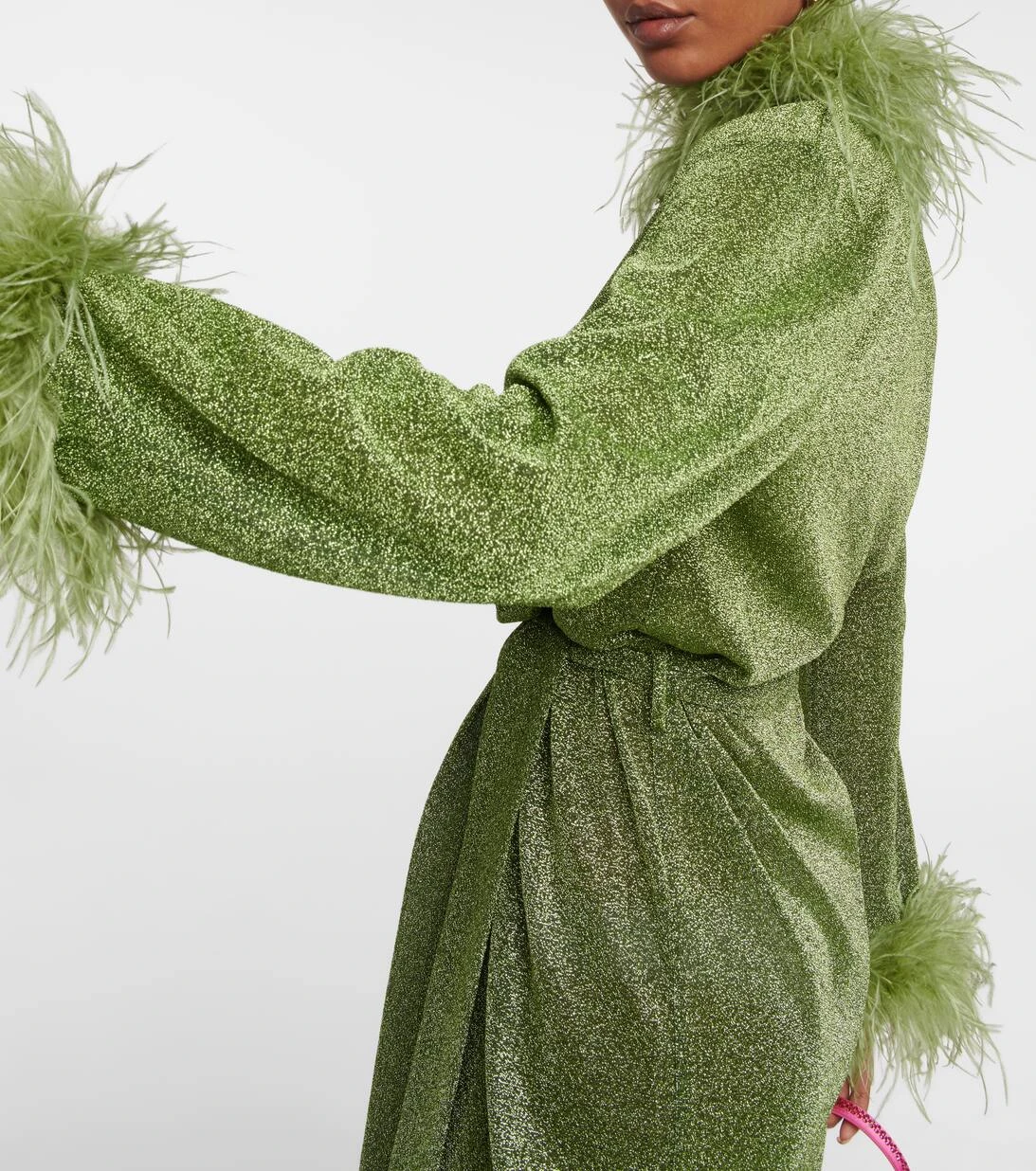 Das Lumière Plumage-Material von Oséree ist mit äußerst feinen Metallic-Fäden versehen, die ein einzigartiges schimmerndes Finish kreieren. Dieser Kaftan präsentiert sich in einem hellgrünen Farbton mit Federbesatz und einem Gürtel, der die Taille betont.