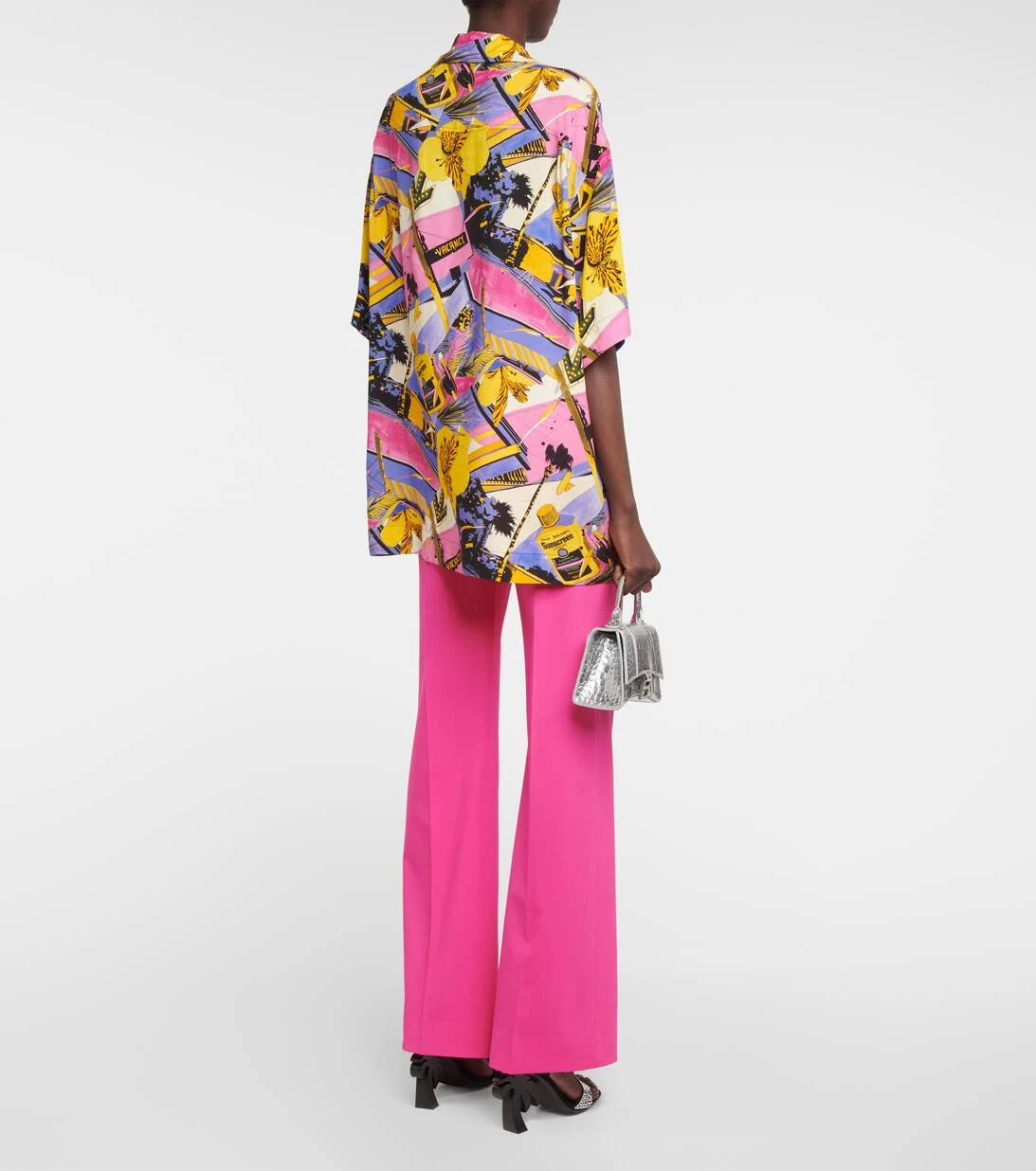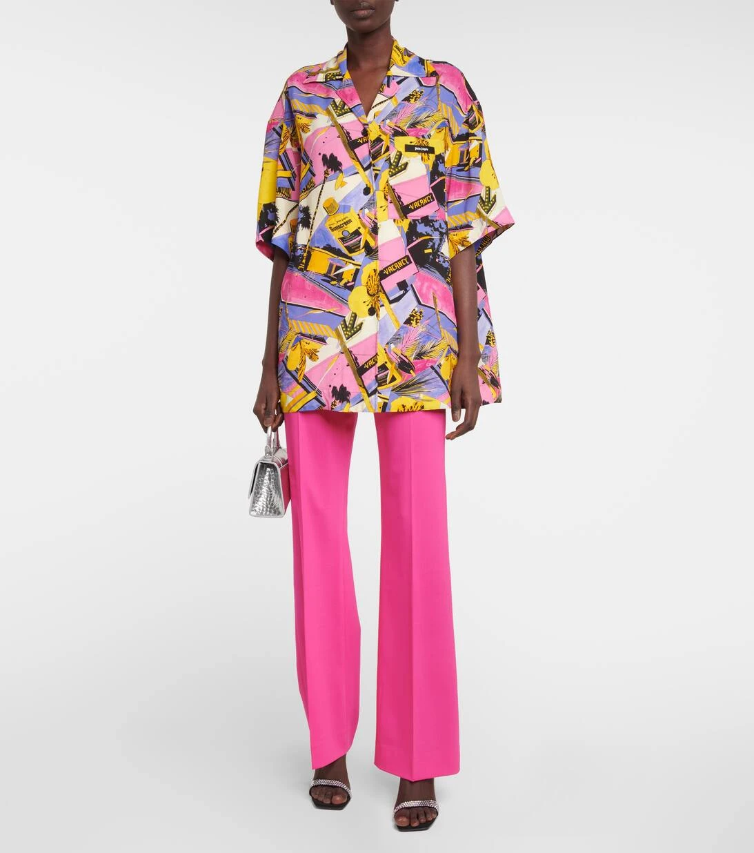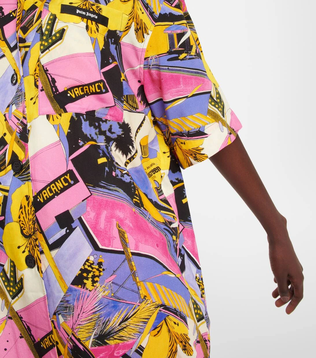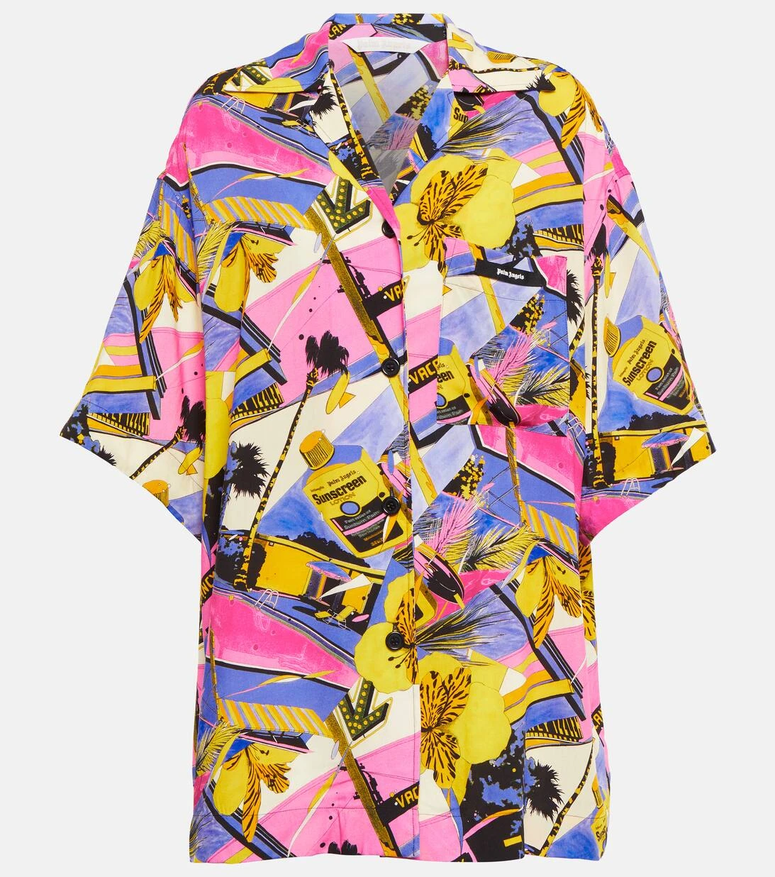 Dieses von der Herrenmode inspirierte Bowling Shirt von Palm Angels ist mit einem lebhaften Miami-Print verziert. Es verfügt über überschnittene Schultern und eine entspannte Oversize-Passform.