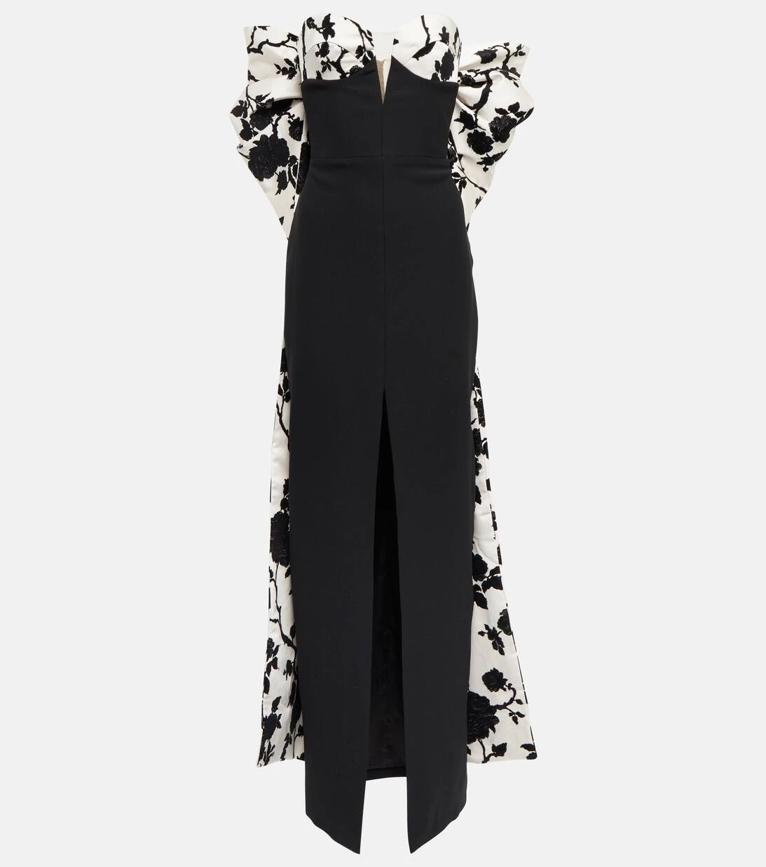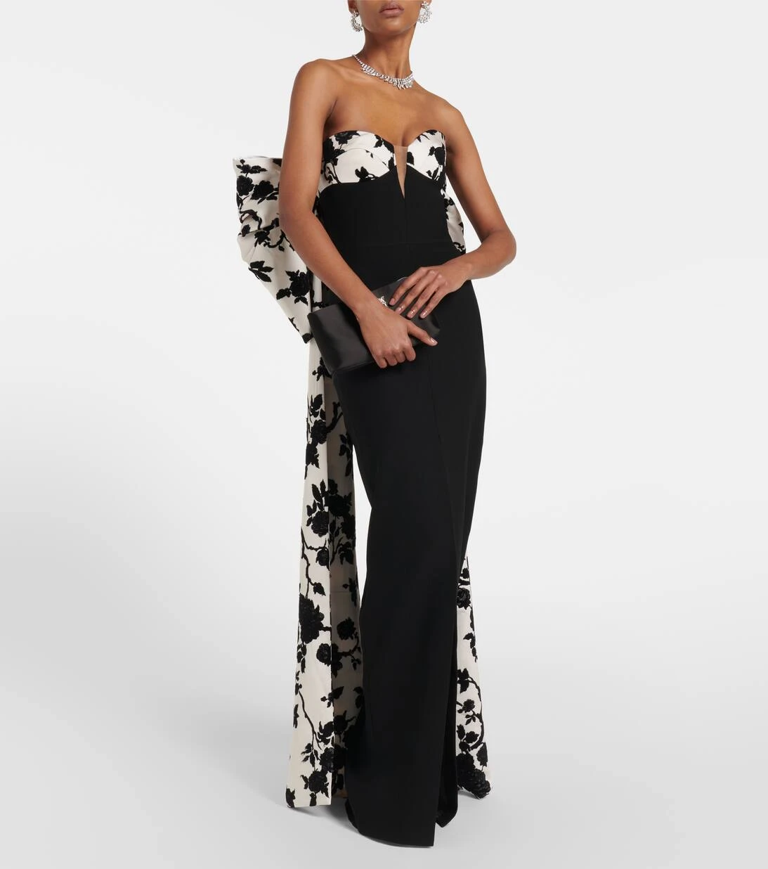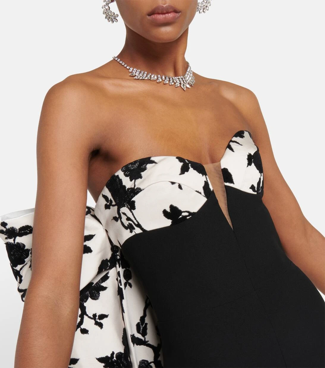 Diese figurbetonte Robe von Rasario bietet elegante Opulenz. Das Design aus Crêpe zeigt sich mit einem markentypischen Bustier-Oberteil sowie einer Oversize-Schleife auf der Rückseite. Beide wurden zudem mit einem floralen Jacquard-Motiv akzentuiert.