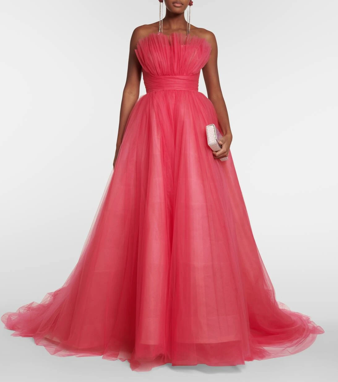 In dieser Robe von Monique Lhuillier sind Sie der Blickfang des Abends. Das Design ist mit einem figurbetonten Off-Shoulder-Oberteil mit voluminösen Rüschen versehen. Der Style aus leichten Tüll-Lagen geht in einen ausgestellten, bodenlangen Rock mit einer Schleppe über.
