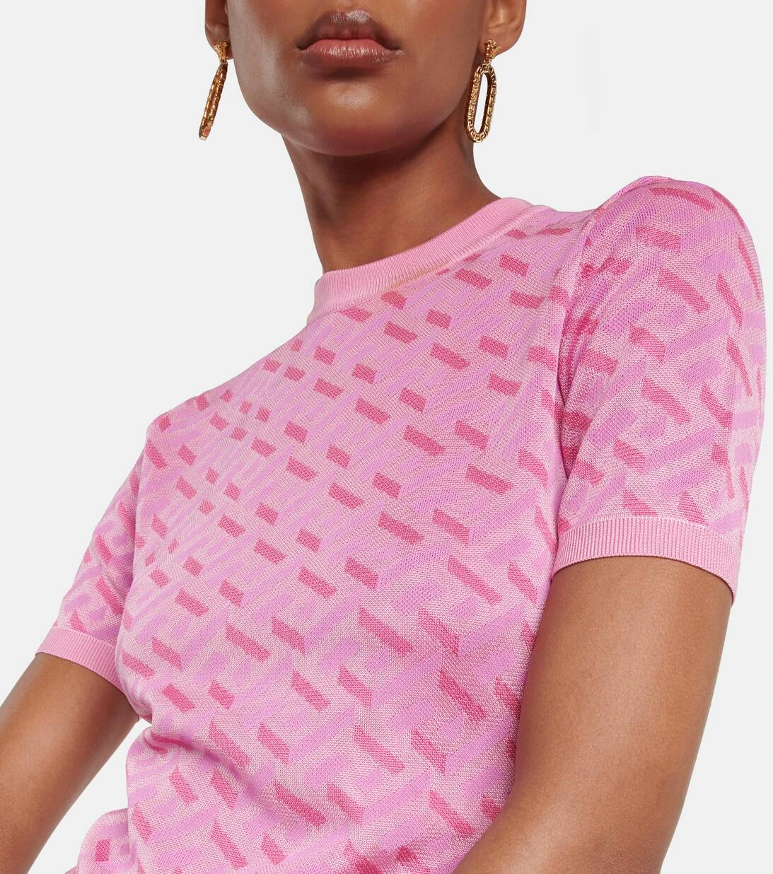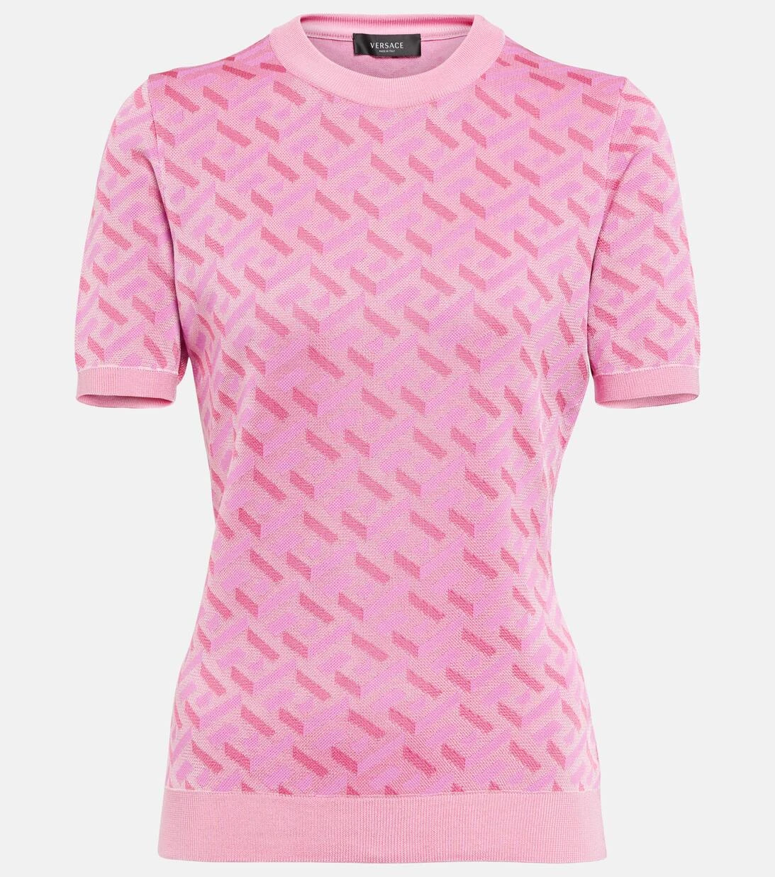 Verleihen Sie Ihrer Garderobe mit diesem Top die unverkennbare Ästhetik von Versace. Das Design aus elastischem Strick aus einem Seidengemisch zeichnet sich durch einen Rundhalsausschnitt, ein La Greca Jacquard-Muster und eine dezente goldfarbene Medusa-Niete auf der Rückseite aus.