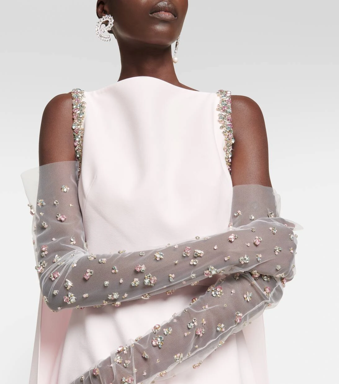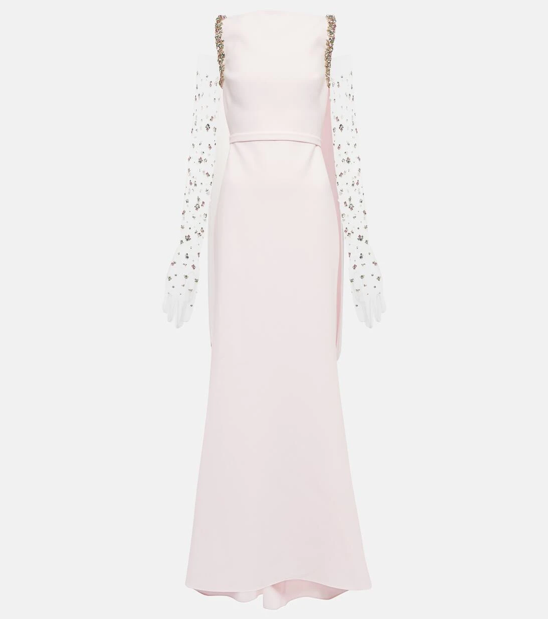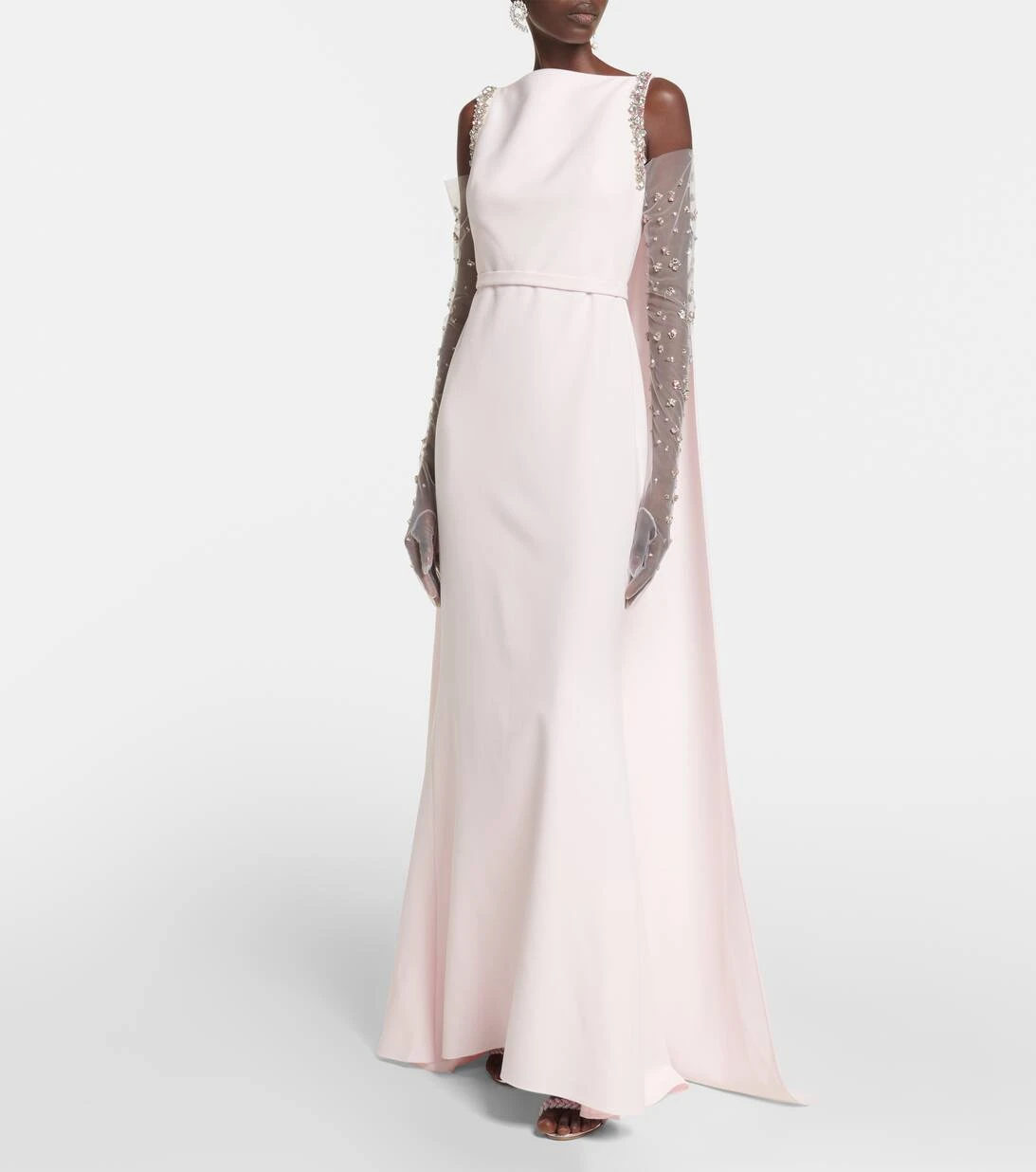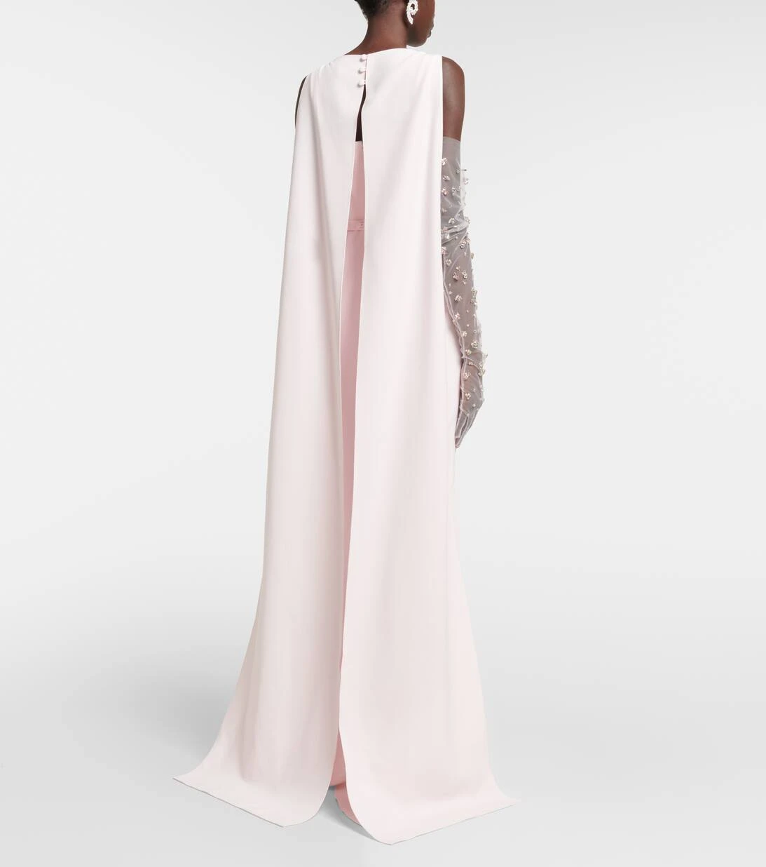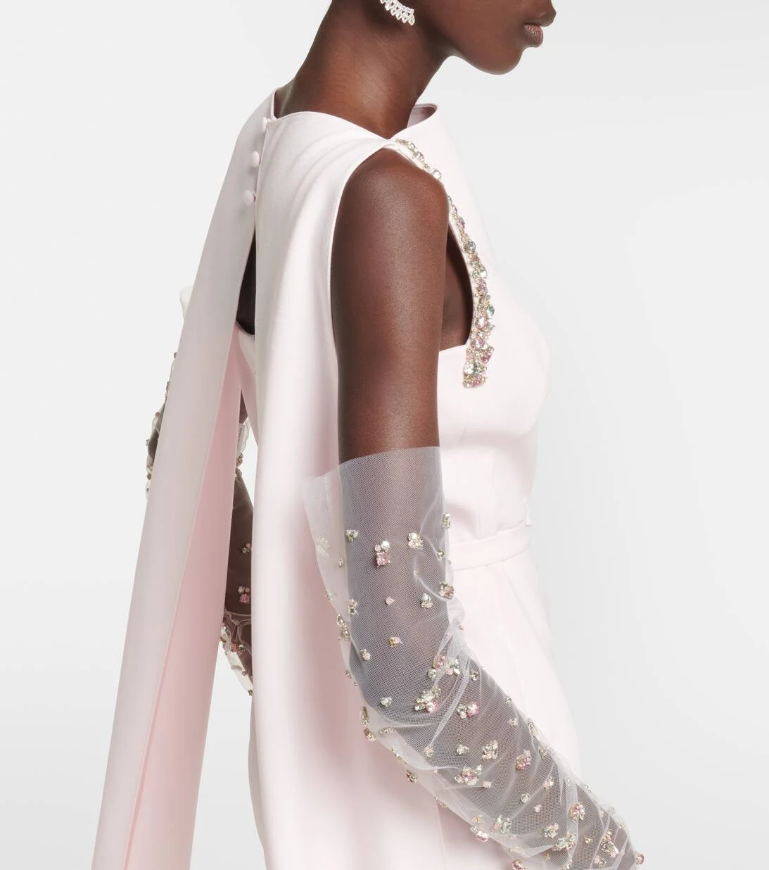 Die Ginevra Robe von Safiyaa verfügt über ein bodenlanges Cape und ist für zusätzlichen Glamour mit Kristallen an den Ärmeln versehen.